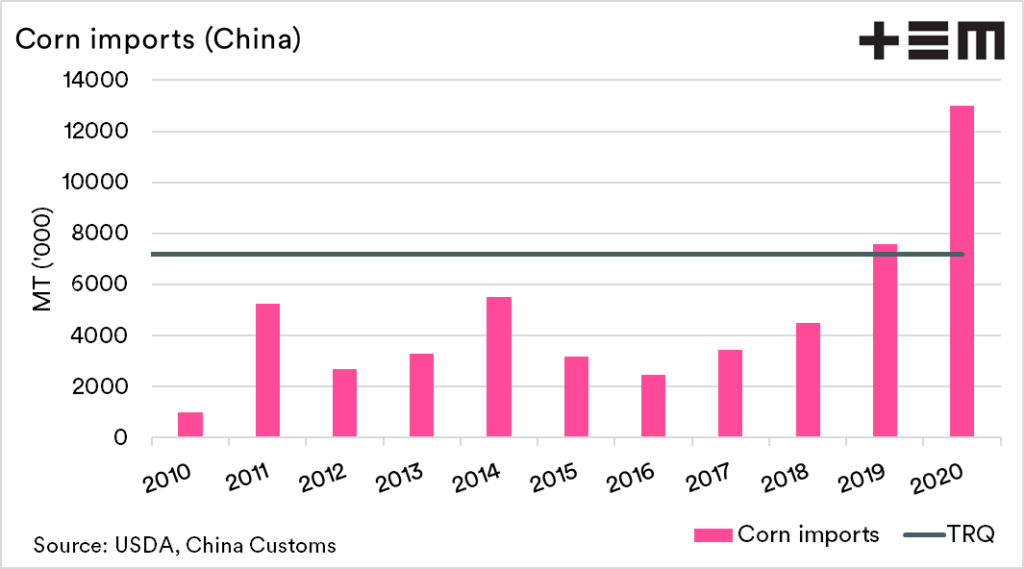 At present, the Chinese government have made no official comments on an increase to the TRQ limit; however, sales to China will see this level easily exceeded. A large import program for China is supportive of corn and therefore wheat.