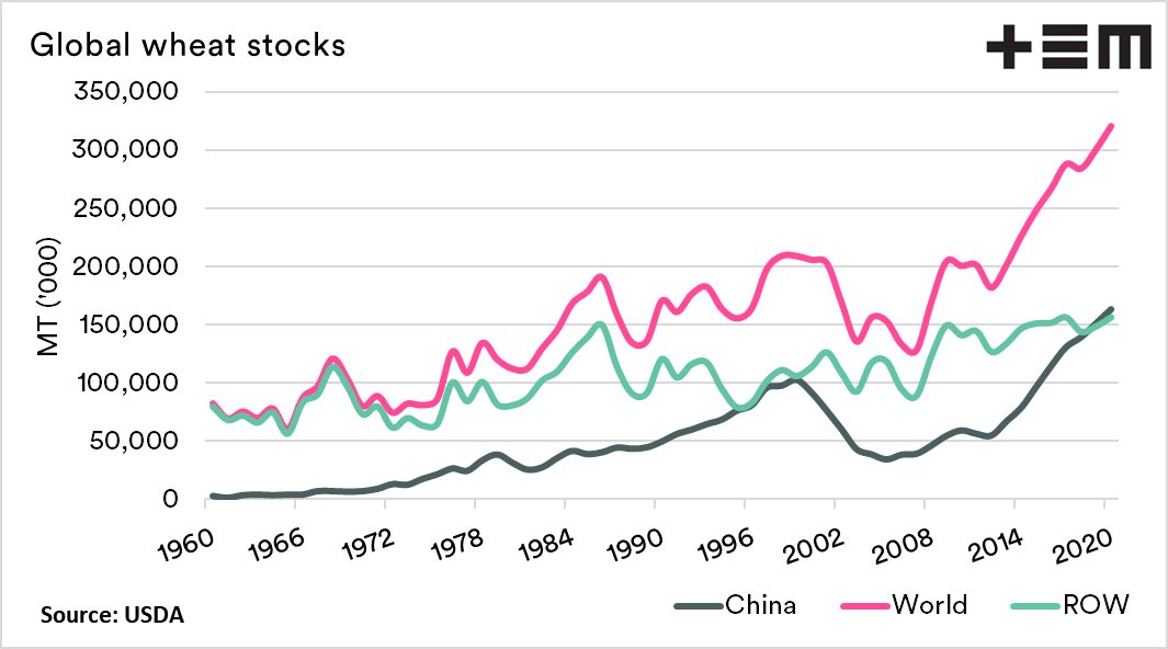 World wheat ending stocks were reduced by 1mmt to 320.5mmt. This maintains them at record levels, bearing in mind that China on ‘paper’ holds 51% of these stocks (Why remove China?). It is important to note that despite the stocks in China, stocks levels remain high.