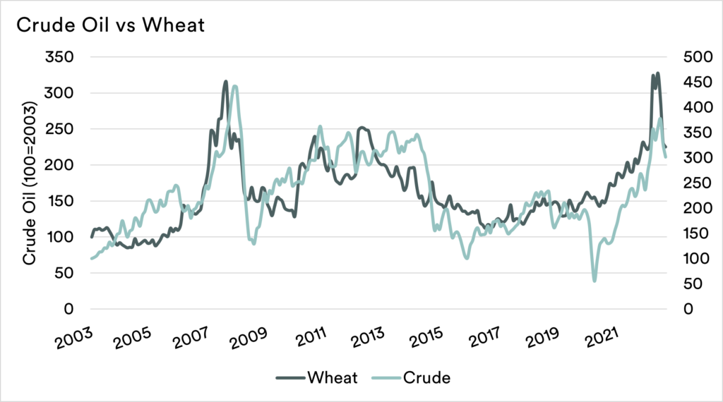 There is a close trend in the movement of crude oil and wheat. Over history, they have tended to ebb and flow in the same direction. This is in part due to our friend corn.