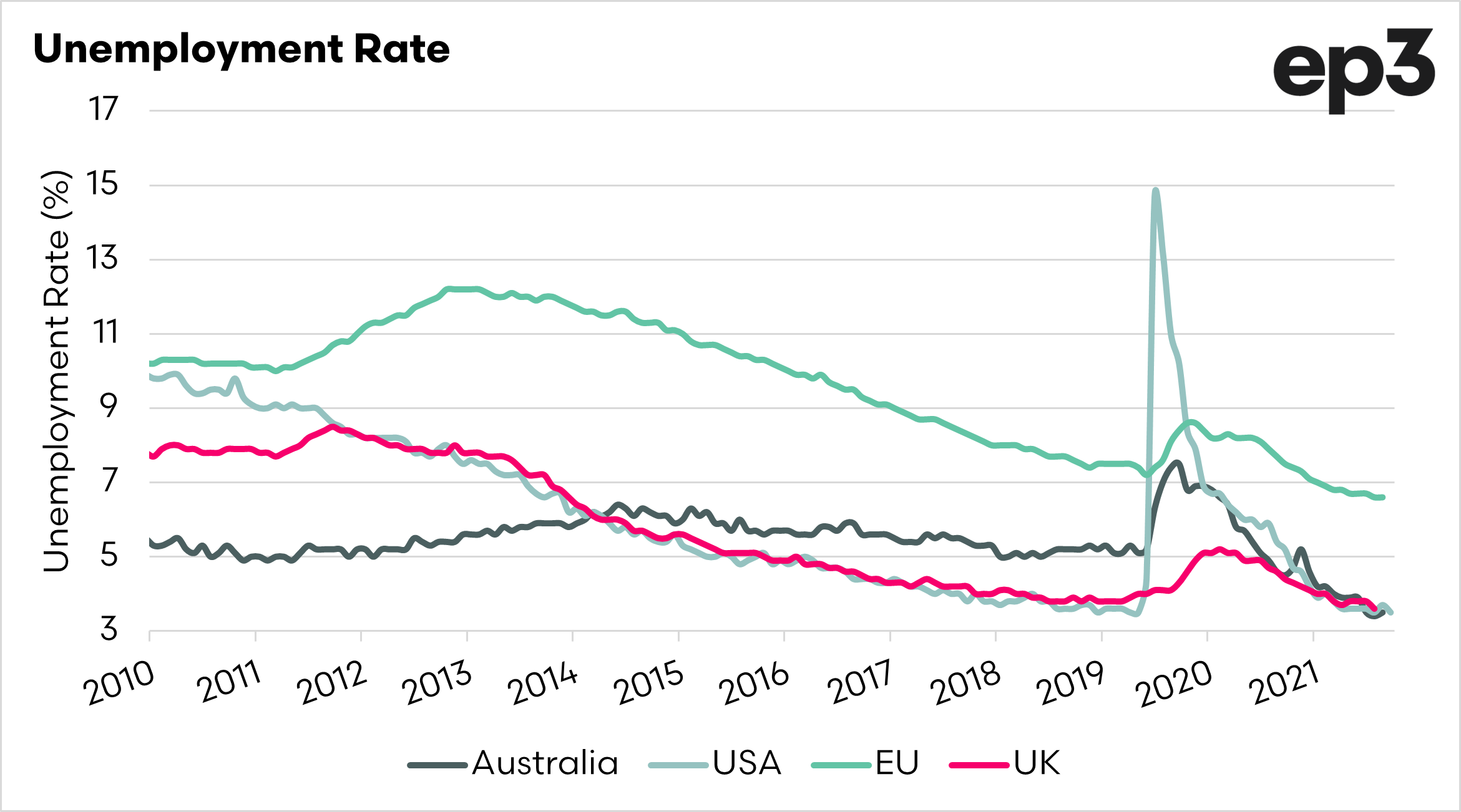 The first chart shows the unemployment rate for some of the major economies. It’s low. It’s really at the point that most that want a job have one.