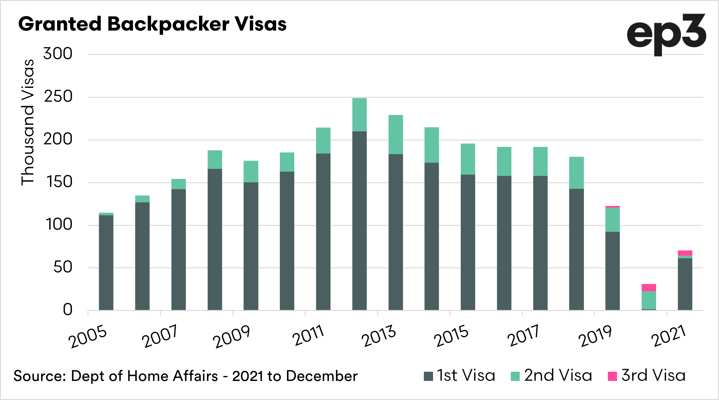 The lockdown of Australia caused a large gap in availability, which can be seen in the chart below. In 2020, there were almost no new backpackers, with largely only those staying on for 2nd or 3rd visas being available.