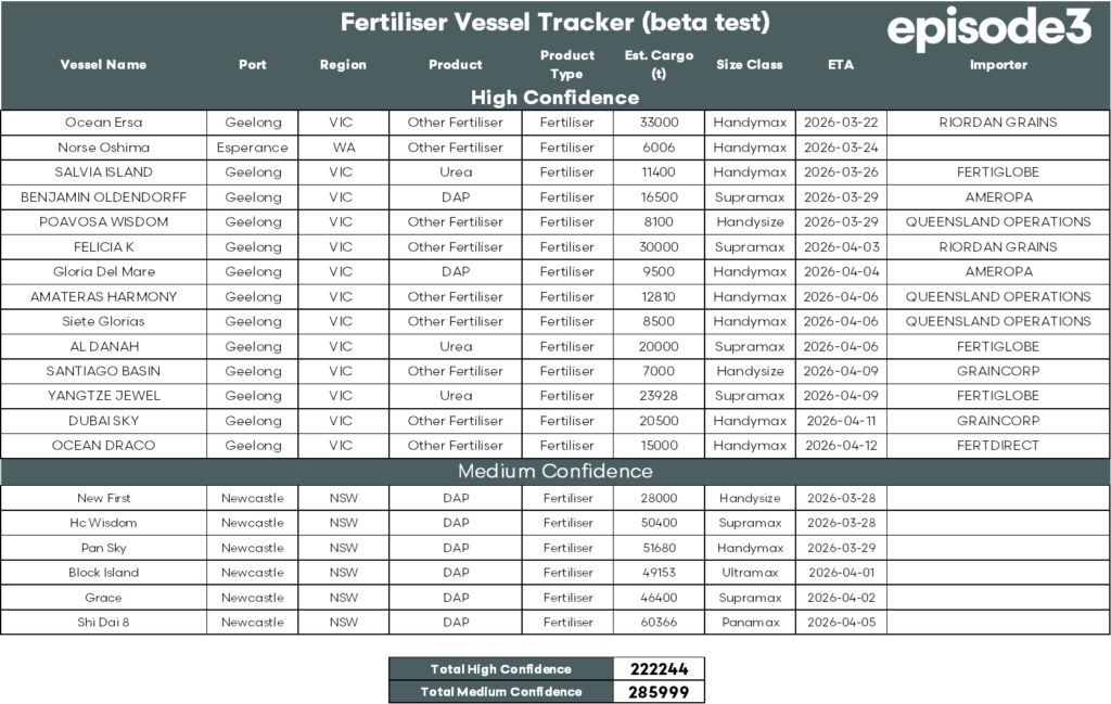 The tool draws on a combination of publicly available shipping data and commercial data sources to monitor bulk vessels heading to Australian ports. It cross-references multiple signals to assess the likelihood of fertiliser cargo on any given vessel, and can identify confirmed shipments with known tonnages, port destinations, berthing schedules and customer details.