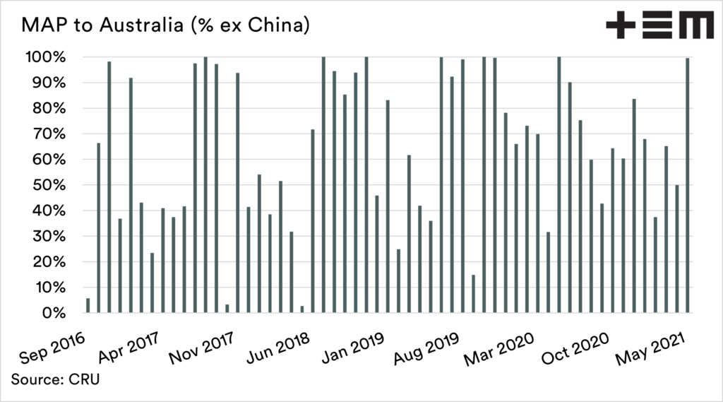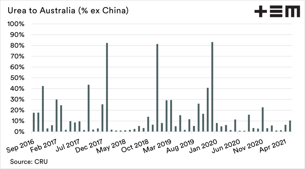 Australia is far more reliant on MAP. Since September 2016, 64% of Australian MAP imports have come from China. During many months this has increased to 100% of imports including as recently as May.