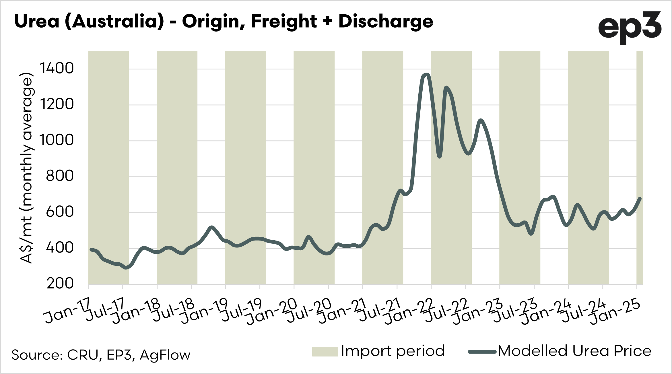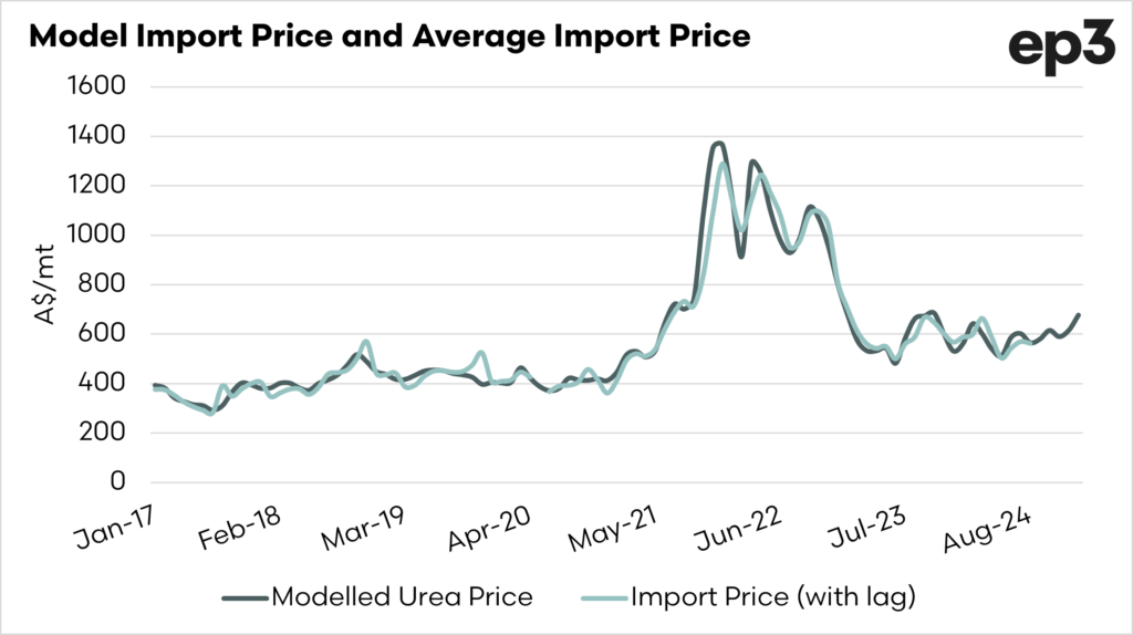 So, let’s take a look at it. The chart below shows our model, which basically explains the cost of buying urea in the Middle East (our biggest source) along with freight, foreign exchange, and unloading in Australia.
