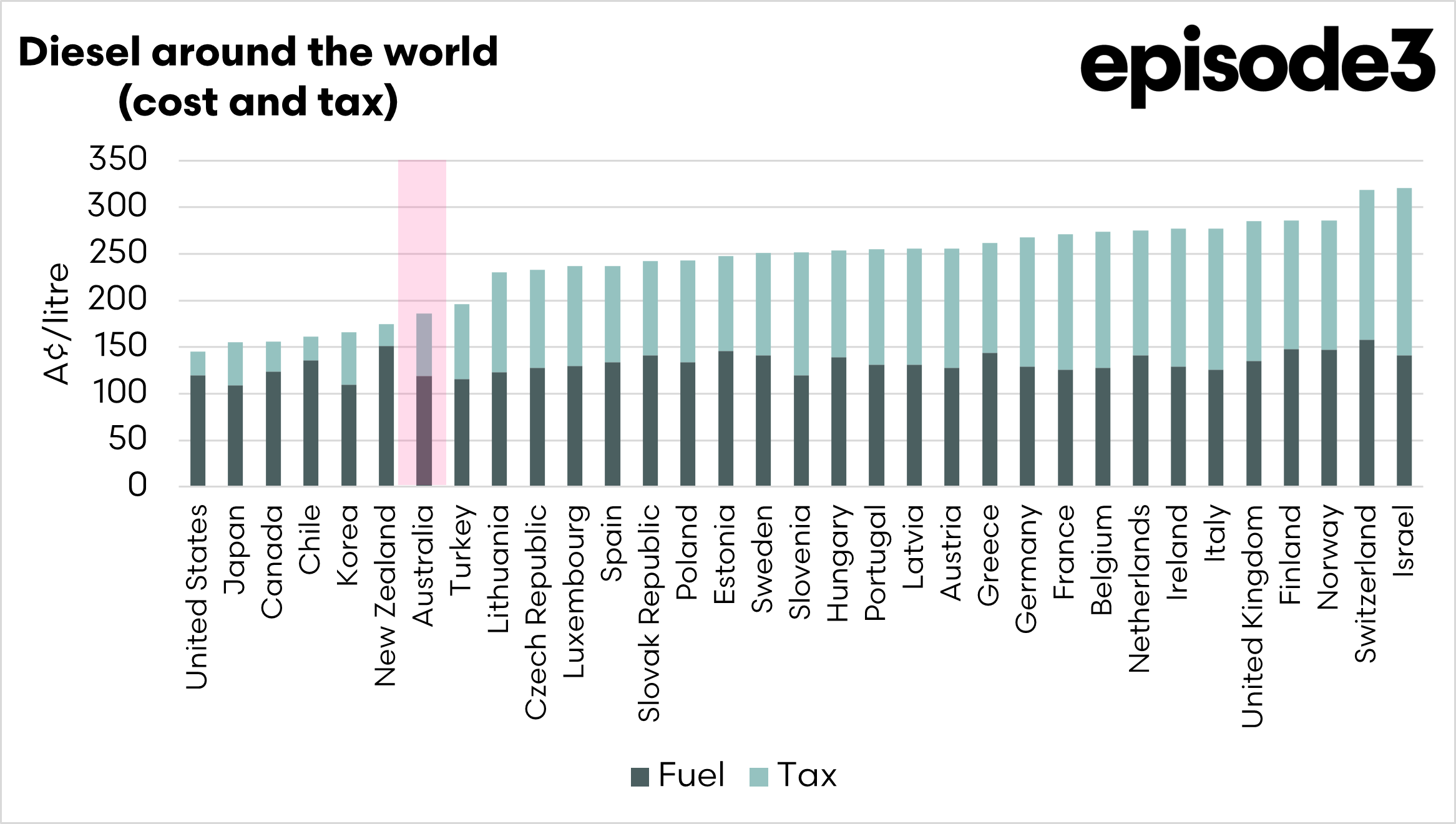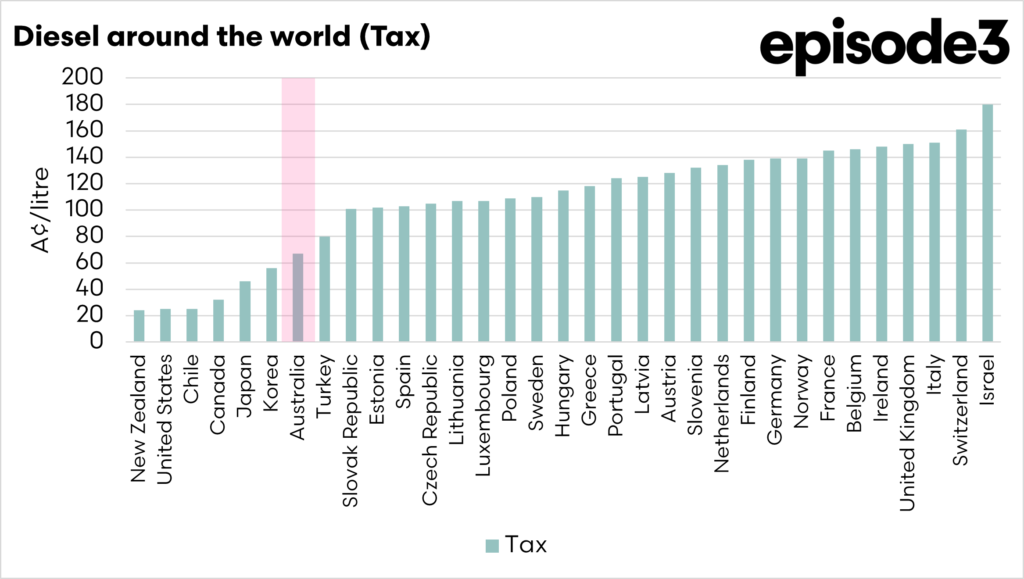 The first chart below shows the diesel price split into cost and tax. The second chart shows the tax. The third chart shows the ratio of tax to cost. Australia is highlighted in pink.