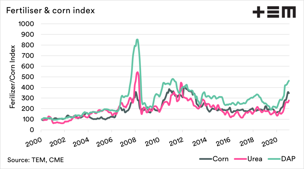 There is a close relationship between fertiliser pricing and grains. The chart below is an index of DAP, Urea and corn pricing.