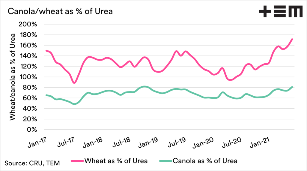 We were asked an interesting question this week on Twitter (see tweet) related to the % of canola price vs urea. In this tweet exchange, we provided comparisons against overseas values.