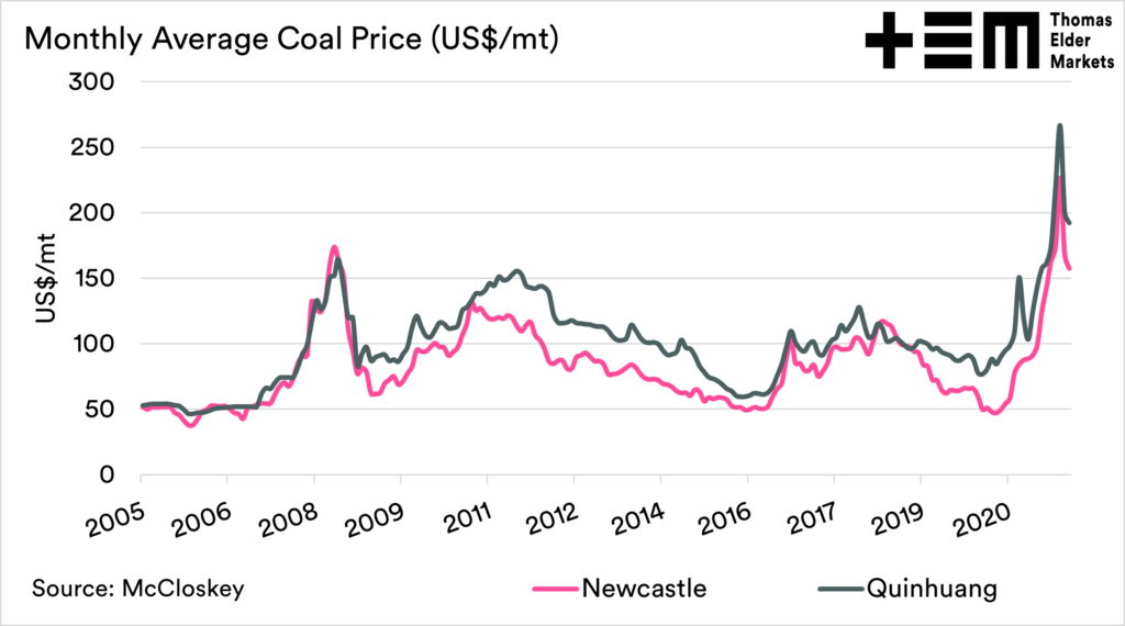 The first chart shows the price of coal at Newcastle and Quinhuang as a monthly average. This is a good place to start as coal is an important energy source for manufacturing Chinese fertilizers. The coal price at Quinhuang. The peak price from at least 2005 to present was in October at US$266; it has since fallen US$74 to US$192.