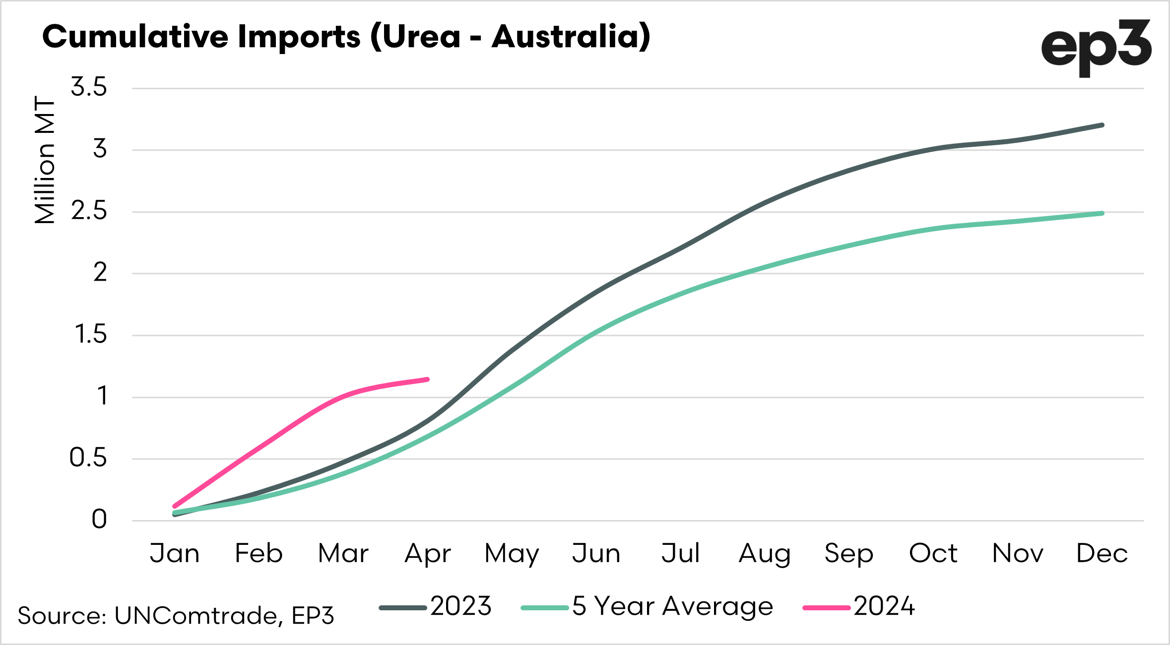 This year is shaping up to be a strong import year as well. In the first chart below, we can see the cumulative imports of urea from January to April, which is the most up-to-date import data.