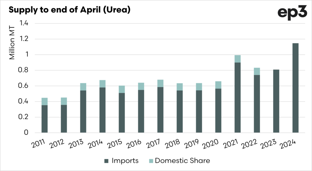 To the end of April, 1.14 million tonnes of urea has been imported, a record for the first four months.