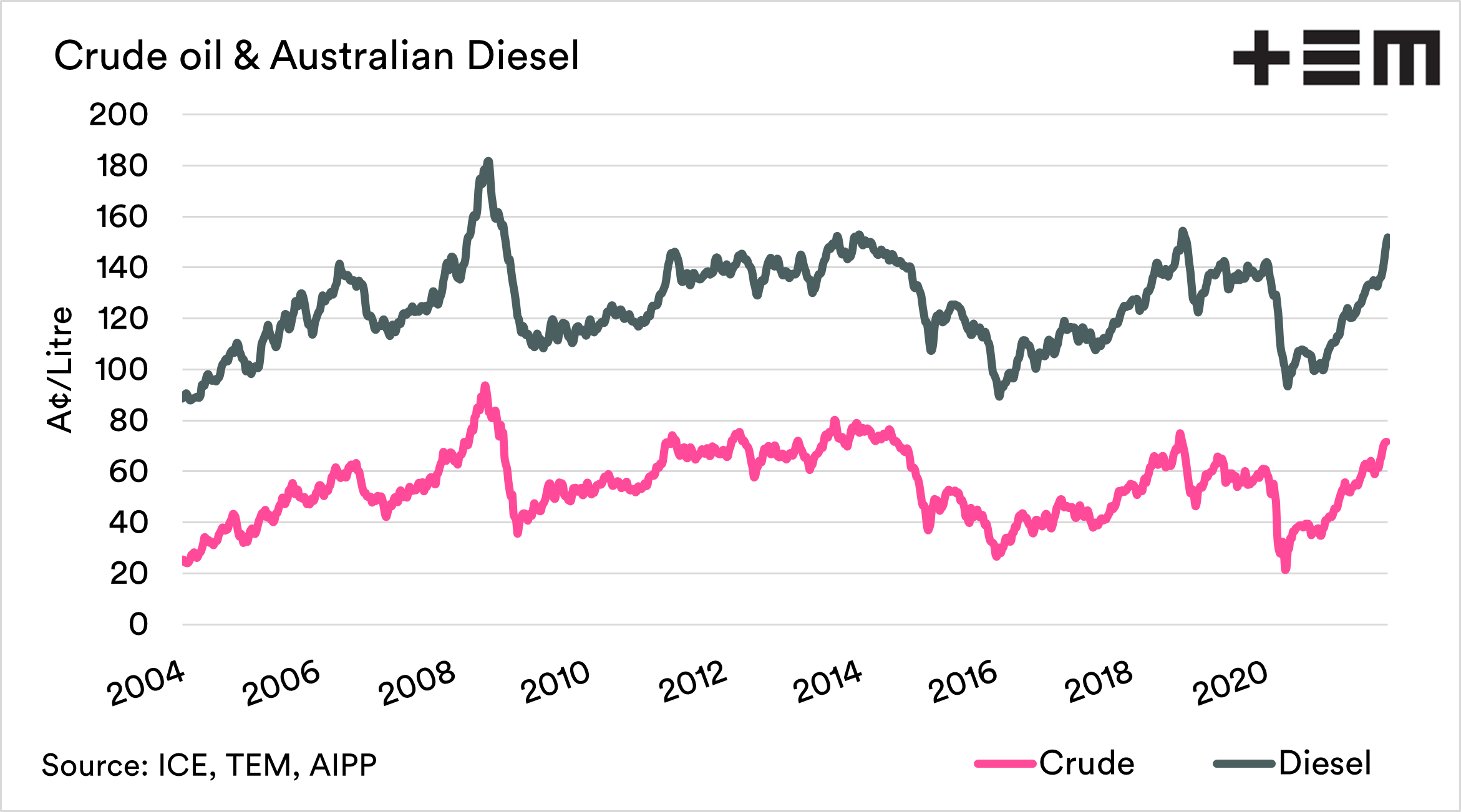 Crude oil is the feedstock for diesel, and it has been travelling in an upward direction since the crash in prices during 2020. As you can see in the chart below, there is a strong relationship between both Australian diesel pricing and crude oil.