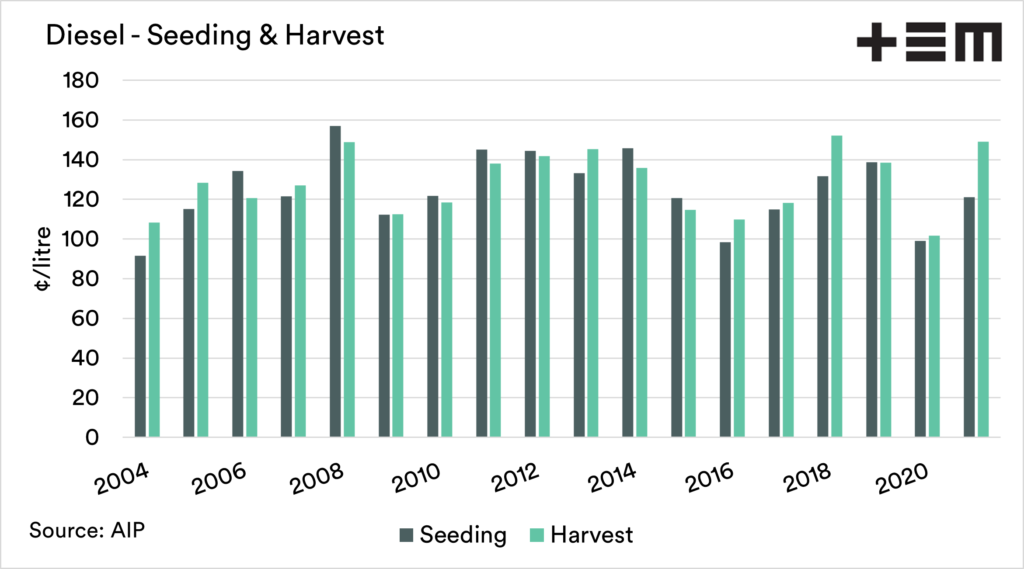 The second chart below shows the average cost of diesel in Australia for the seeding (April) and harvest (October) purchase periods.