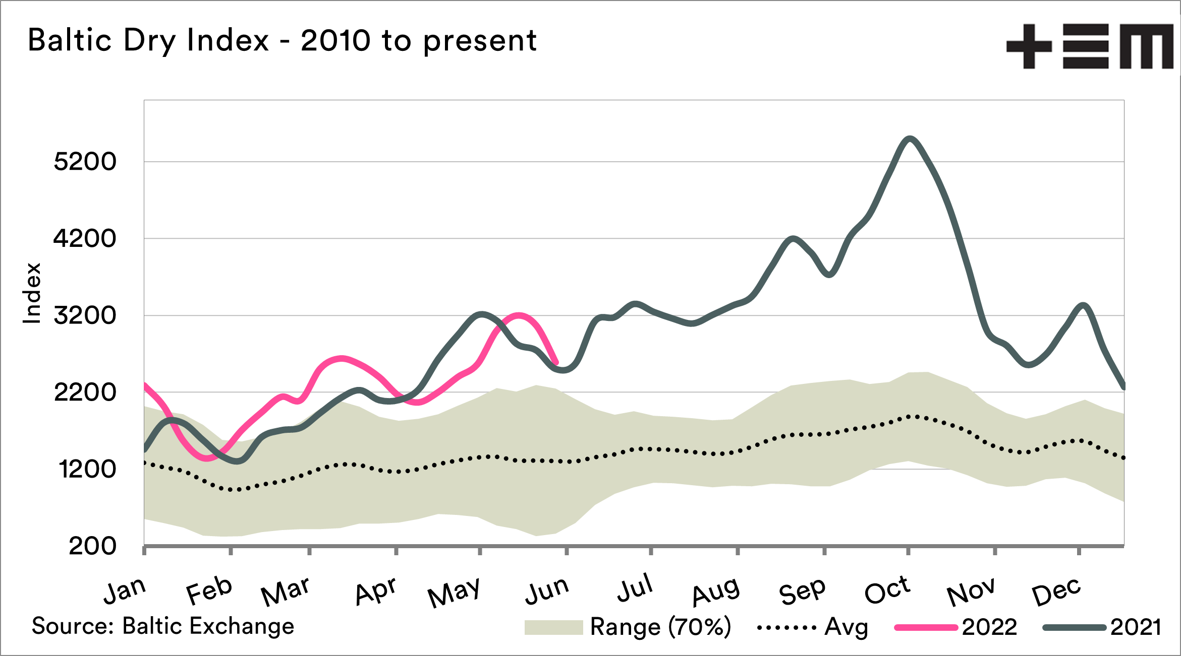 The baltic dry index (BDI) is an index which is used to show the trend in bulk freight costs. We have written about its purpose several times (here) from both a primary and secondary purpose. The BDI has been following a similar trend to last year and is sitting above the typically expected range experienced over the past twelve years.