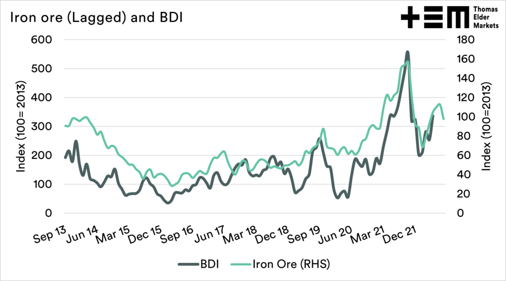 A slow down in the global economy would likely see iron ore demand fall, especially in the event of a Chinese slowdown. This would have two potential effects on Australian grains, a weaker A$ and cheaper freight to our customers.