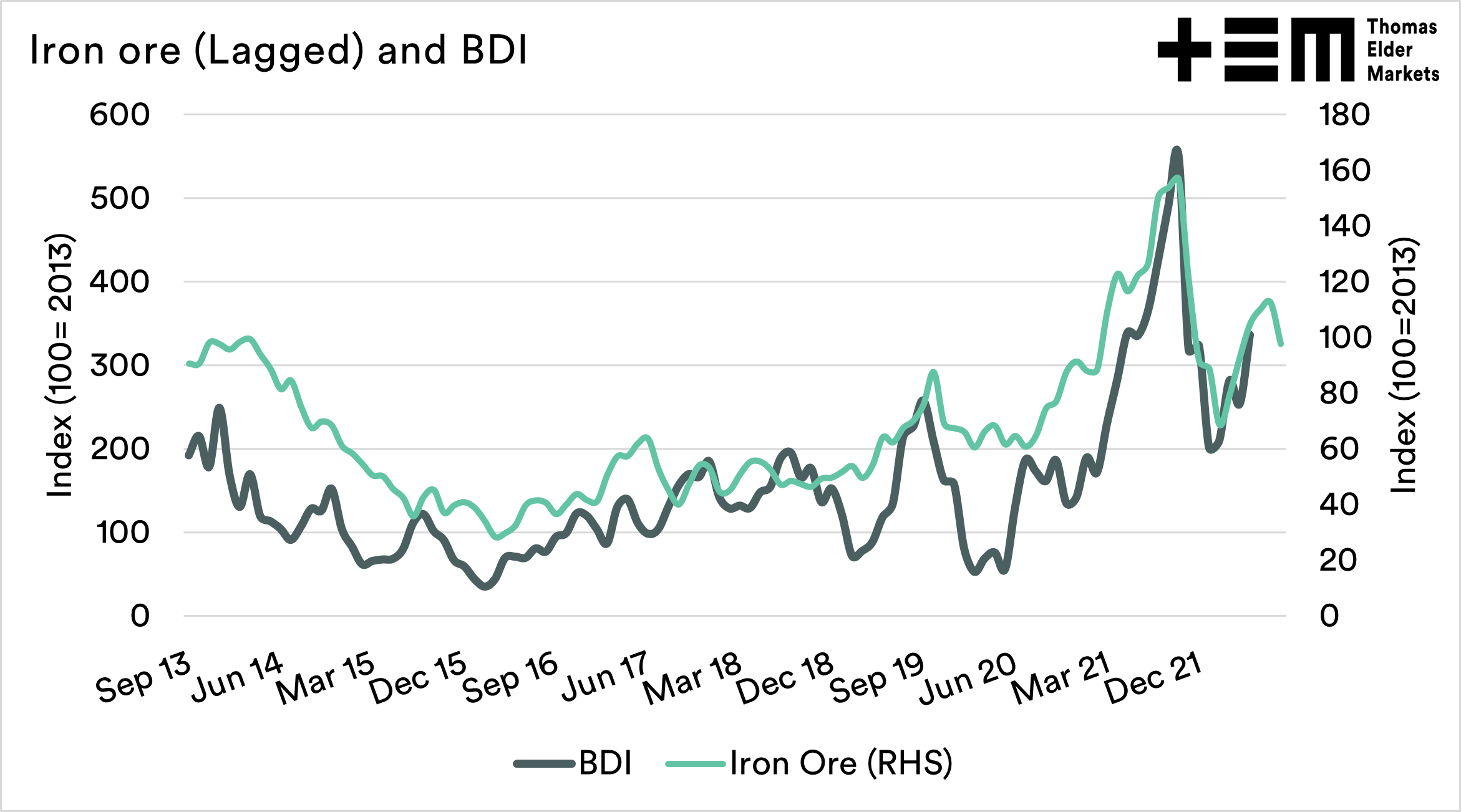 Iron ore is one of the largest commodities moved in bulk, and we see a correlation between price movements of ore and the BDI. When iron ore prices rise, we tend to see an increase in the BDI and vice-versa. The chart below shows the relationship between the two when iron ore is lagged for four weeks.