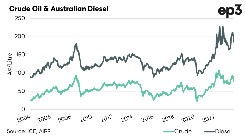 I drove from Canberra to Melbourne last week, and it hurt my pockets each time I filled up. Diesel has been incredibly expensive in recent years, and it is one of the key inputs into agriculture (and the post-gate supply chain).