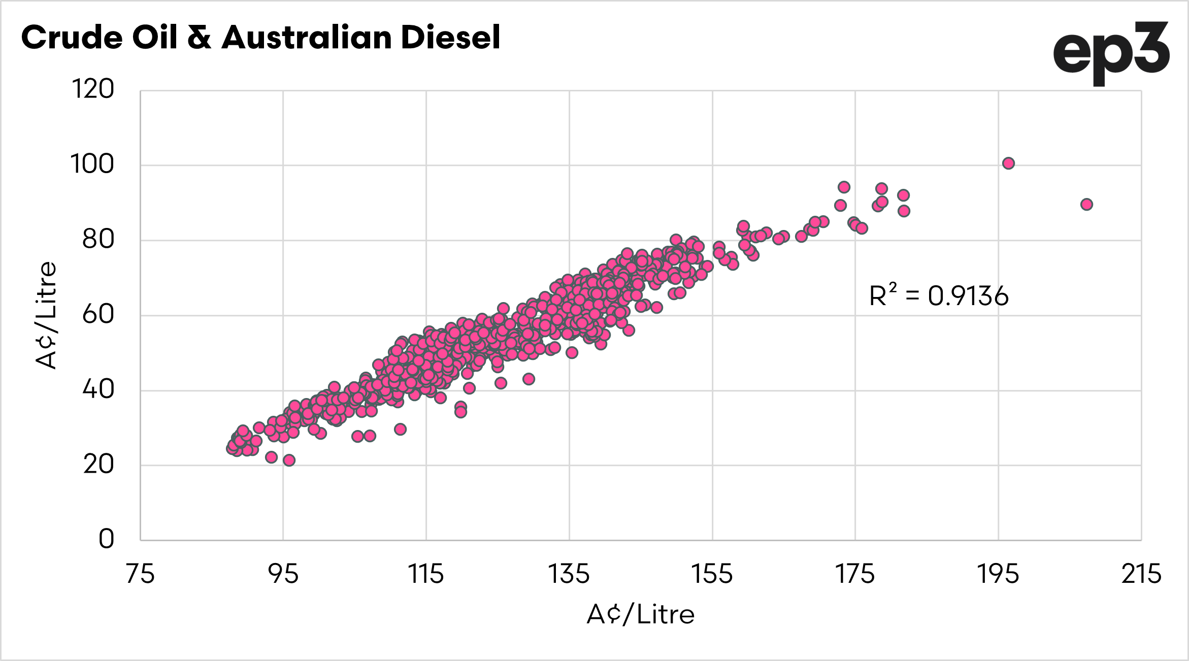 The cost of crude oil drives the price of diesel. We all know that, but we can see it clearly in the first chart below, which shows the price correlation between both.