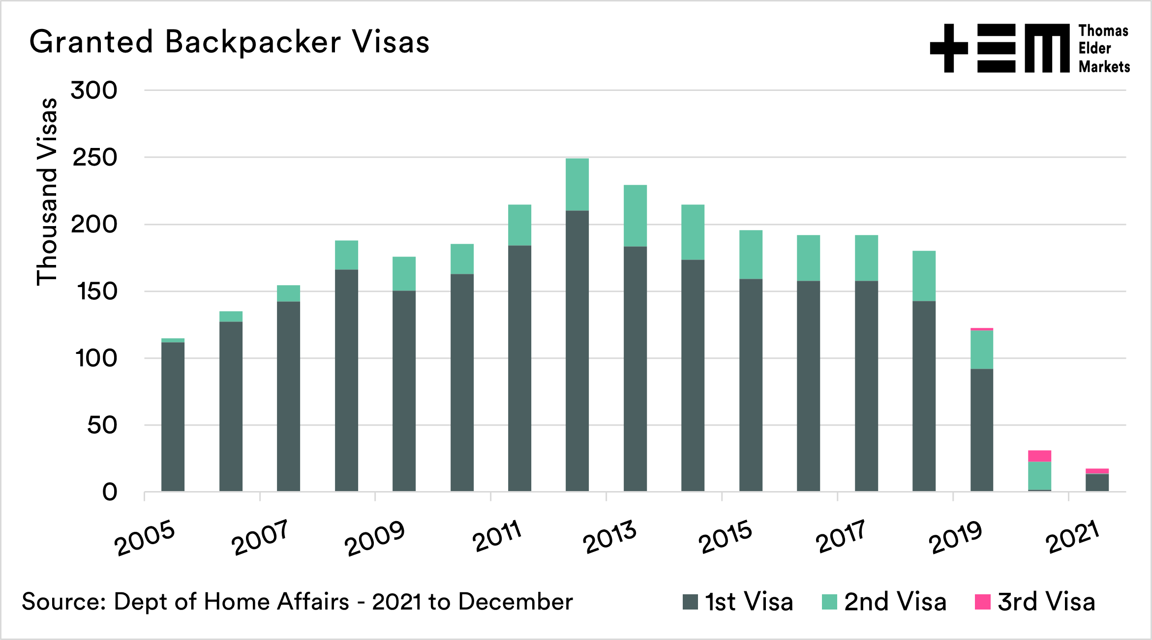 The average number of visas was around 205,000 per year during the last decade. In the 2020 financial year, it was 31200, and up until December 2021, it was 17500. A huge fall, but not surprising considering no one could get through our border.