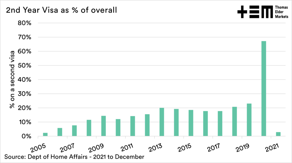 The next thing that I think is important is the lack of second-year visas applications. In a typical year, just under 20% of applicants would be on a second-year visa. There were hardly barely enough first-year visas last year to fill a Bondi nightclub (1749).