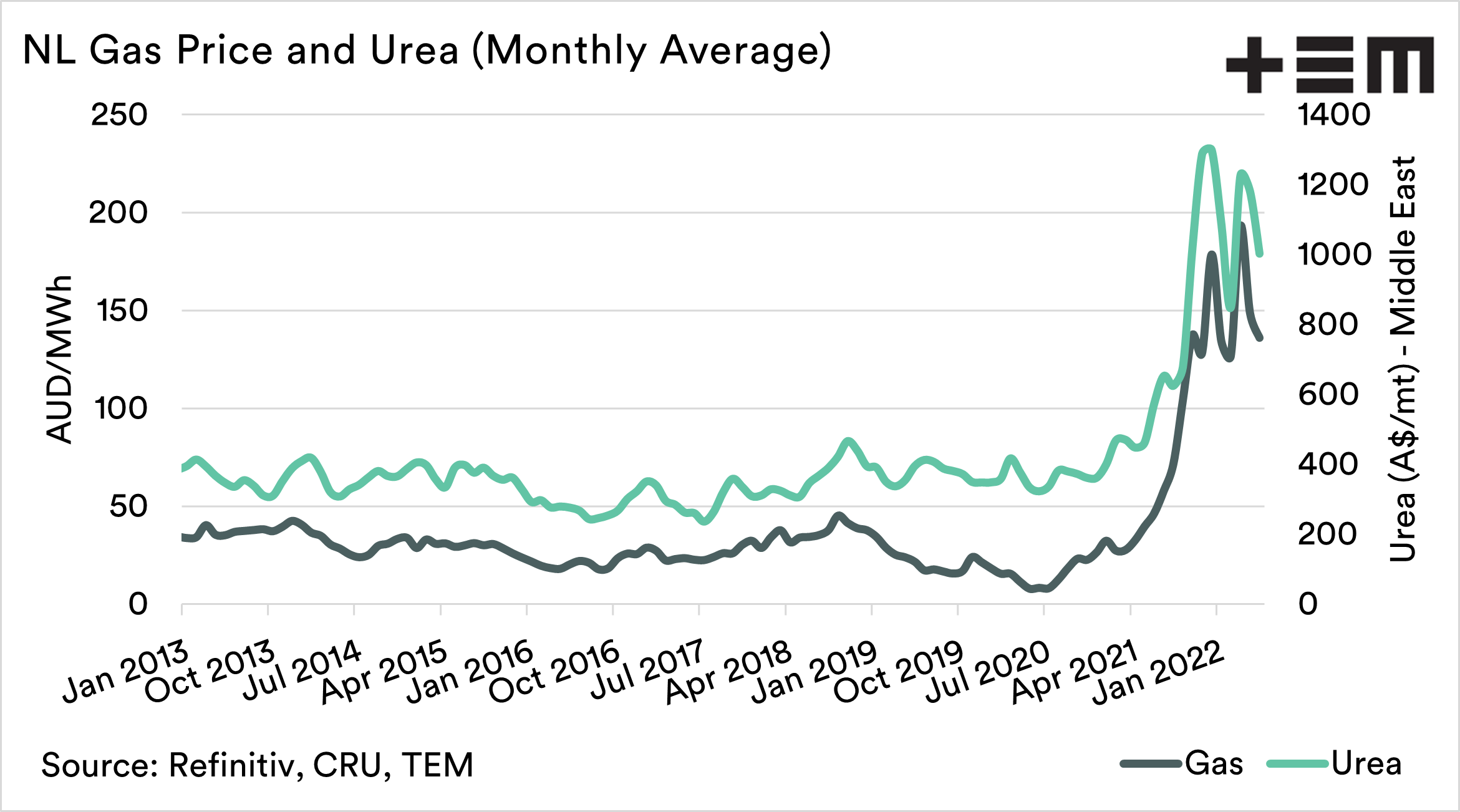 Firstly let’s look at the major input for urea. Gas is the major input for urea, and therefore as gas goes up, so do urea prices. The chart below shows the monthly average price for gas and urea going back to 2013.