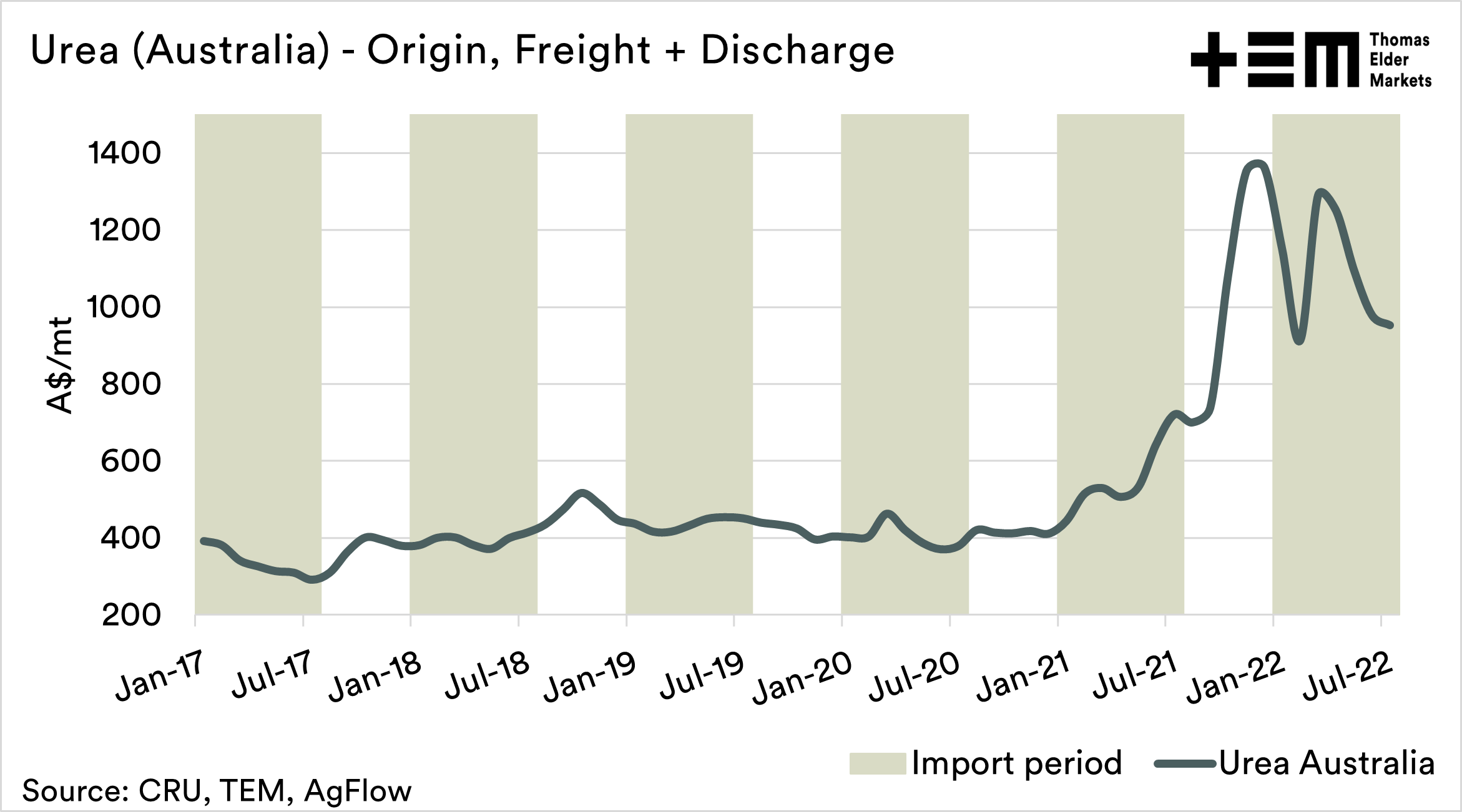 Our cost and freight fertilizer indicate the purchase cost of Urea, freight to Australia, and discharge into port. It is not intended to be an exact number but more to indicate the trend.