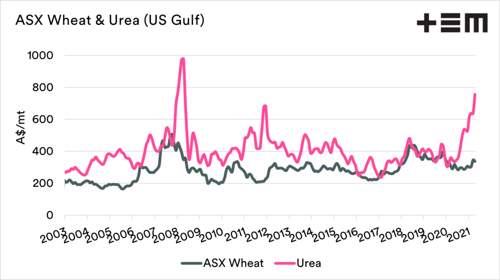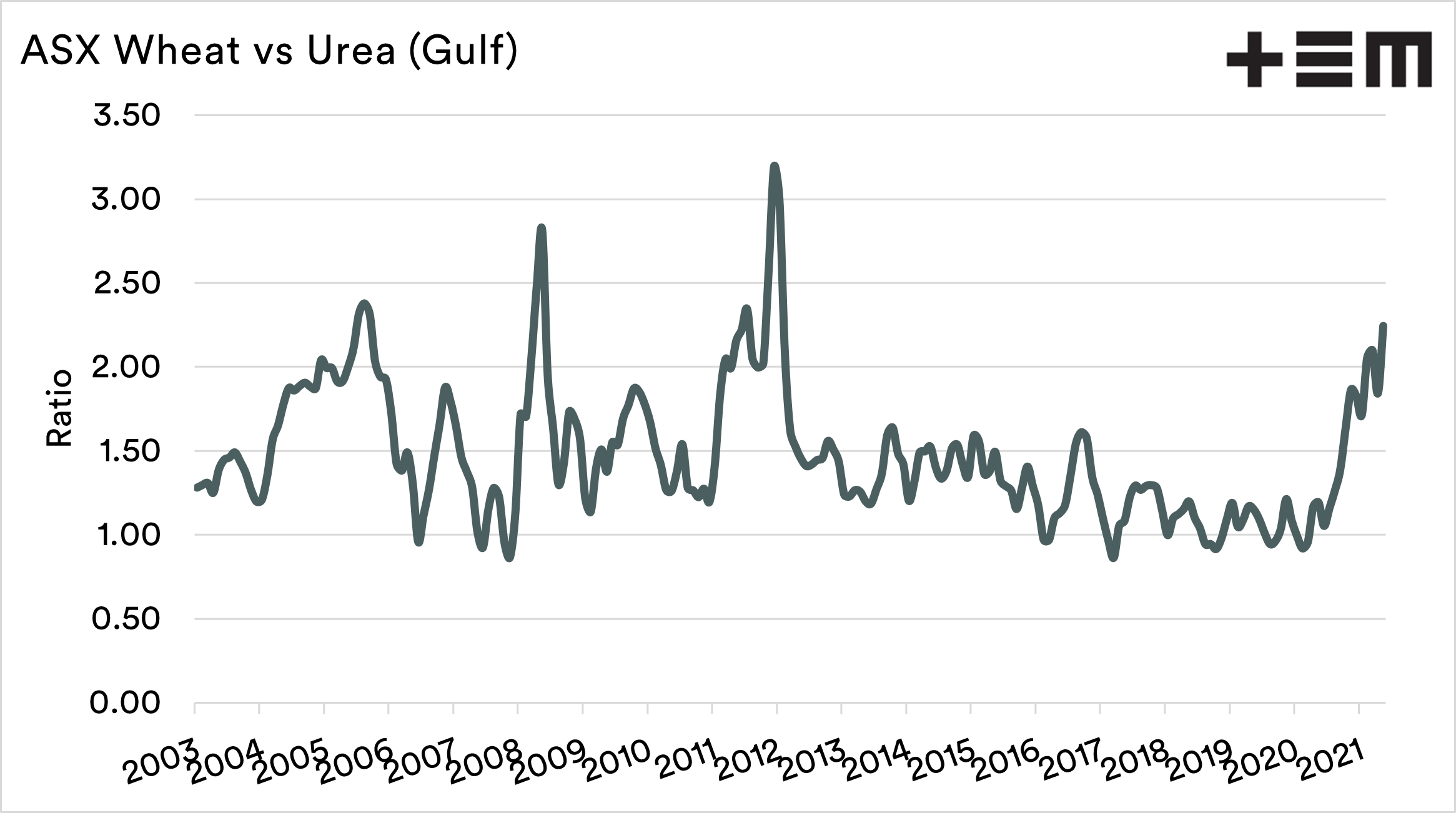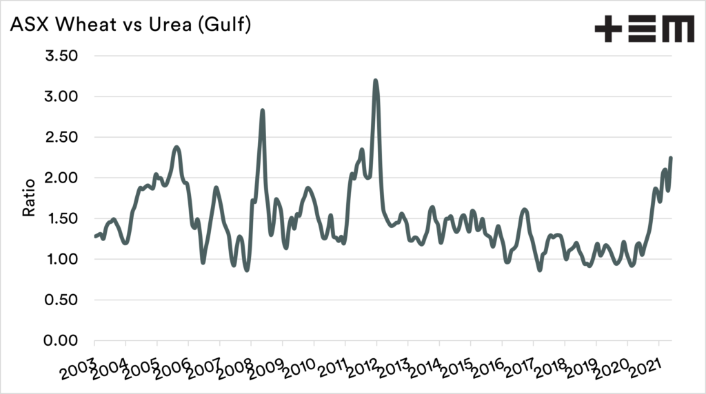 The rising grain price will cover the increase in price? The second chart below shows the ASX wheat price against the US Gulf urea price as a ratio. In September, it costs 2.2mt of wheat to purchase 1mt of urea. The average has been 1.38 for 2010 to 2020.