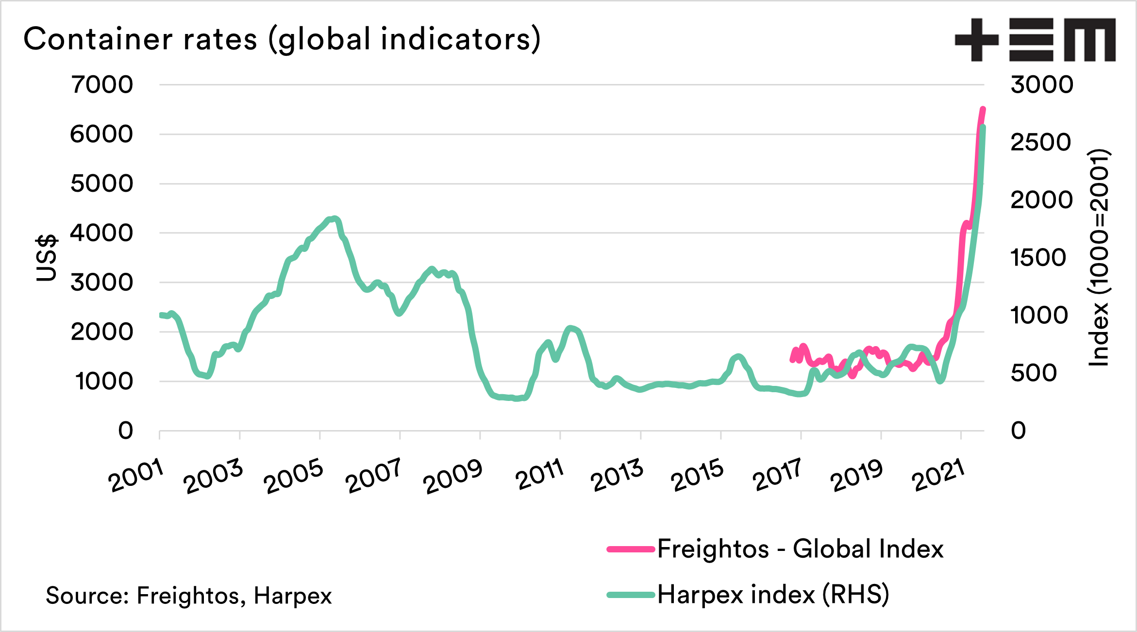 The third chart shows the cost of containers, and these continue to defy gravity. This is the global index, and as we can see, it hasn’t been higher. This has a big impact on many of our agricultural products, including meat, wool and grains (especially pulses).