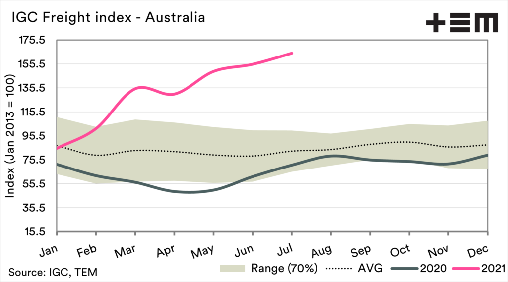 The second chart shows the seasonality of the IGC freight index and shows how far above the norm that freight has become.