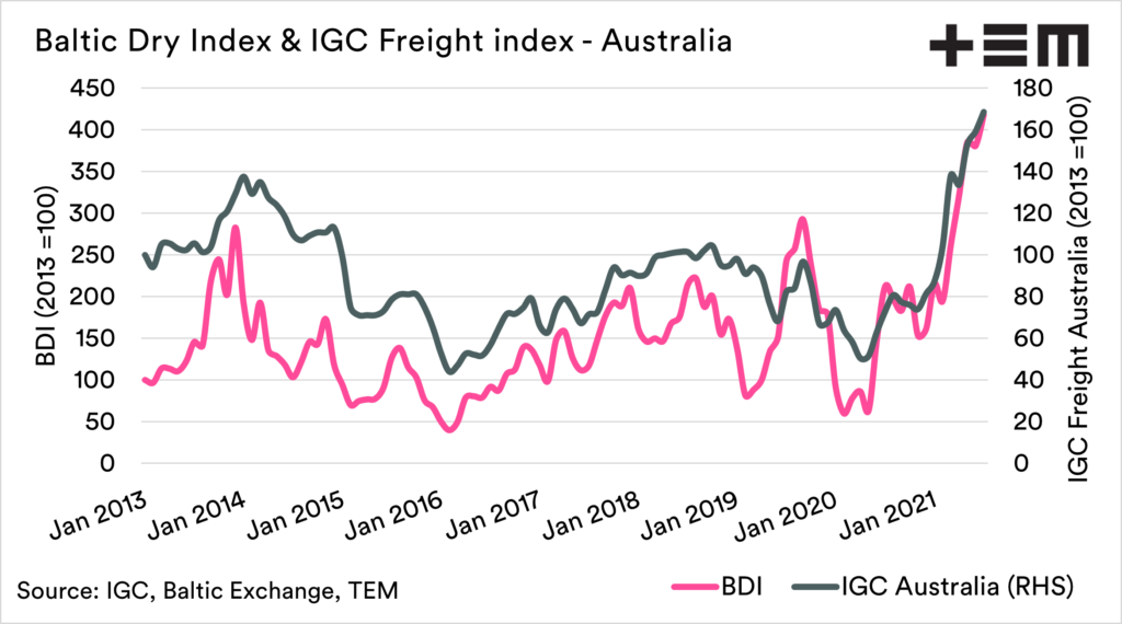 The first chart below shows the Baltic Dry Index, which is both an indicator of bulk freight and is considered an economic indicator (see here). Included is the International Grain Councils freight index for vessels ex Australia.