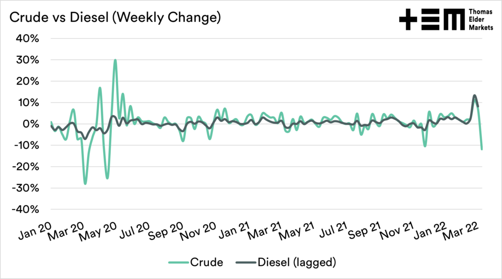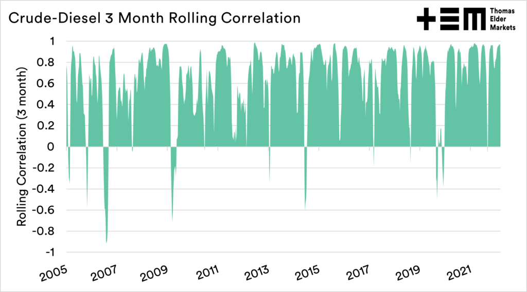 So how long does it take to flow through? The second chart shows the weekly change in price between crude oil and Australian diesel. This has been lagged for one week on diesel. When we look at the correlation of the two movements over time, it is far lower when not lagged. This points towards there being a delay – but only about a week before prices react to the crude.