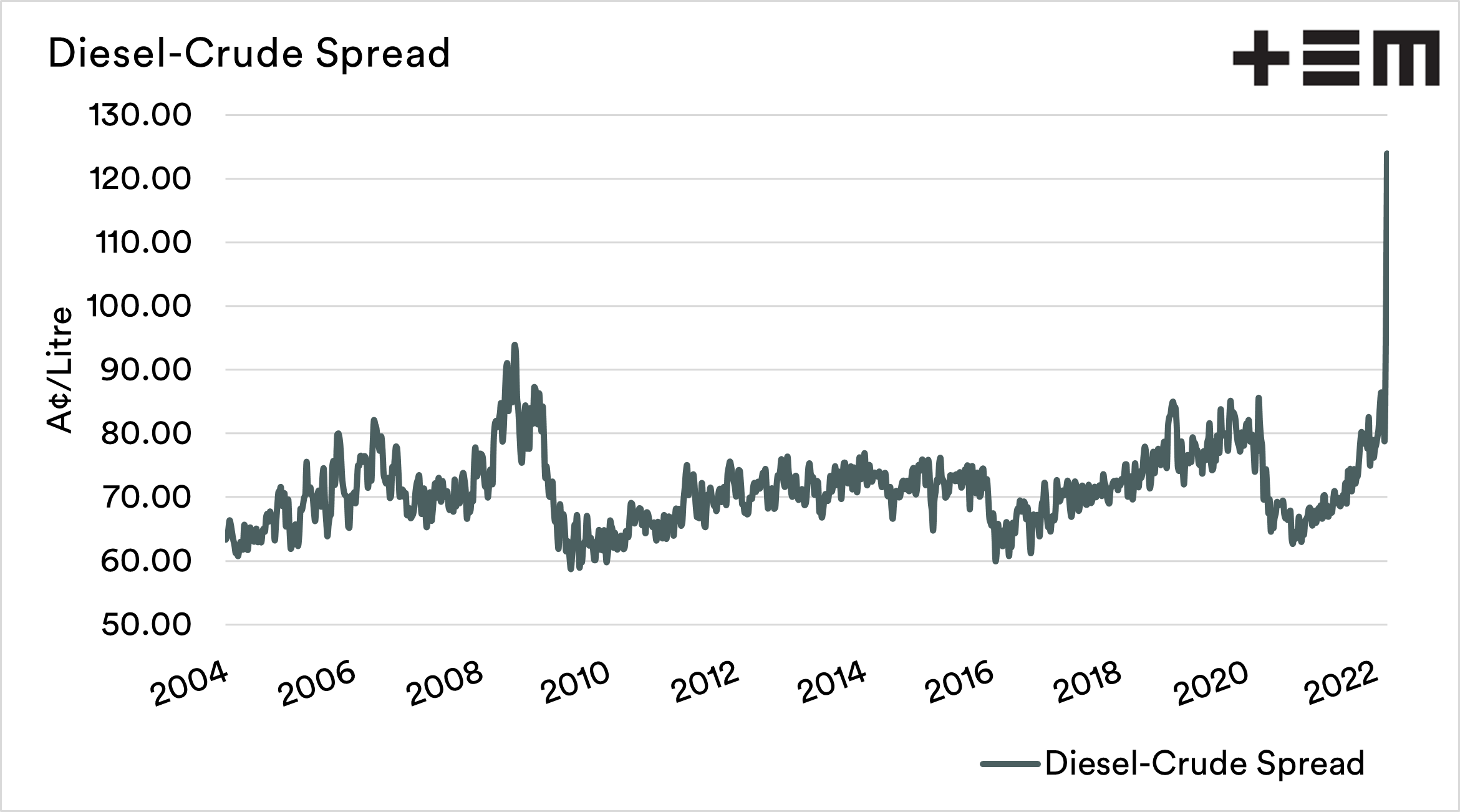 At the moment, the diesel price is averaging A$2.12/l, so if the spread were to return to a normal spread of approx A$0.70/l to A$0.80/l, we would see diesel prices revert back to a more palatable level of A$1.58 to A$1.68. Fingers crossed, but bear in mind ignoring the recent fortnight; this would still be close to record levels.
