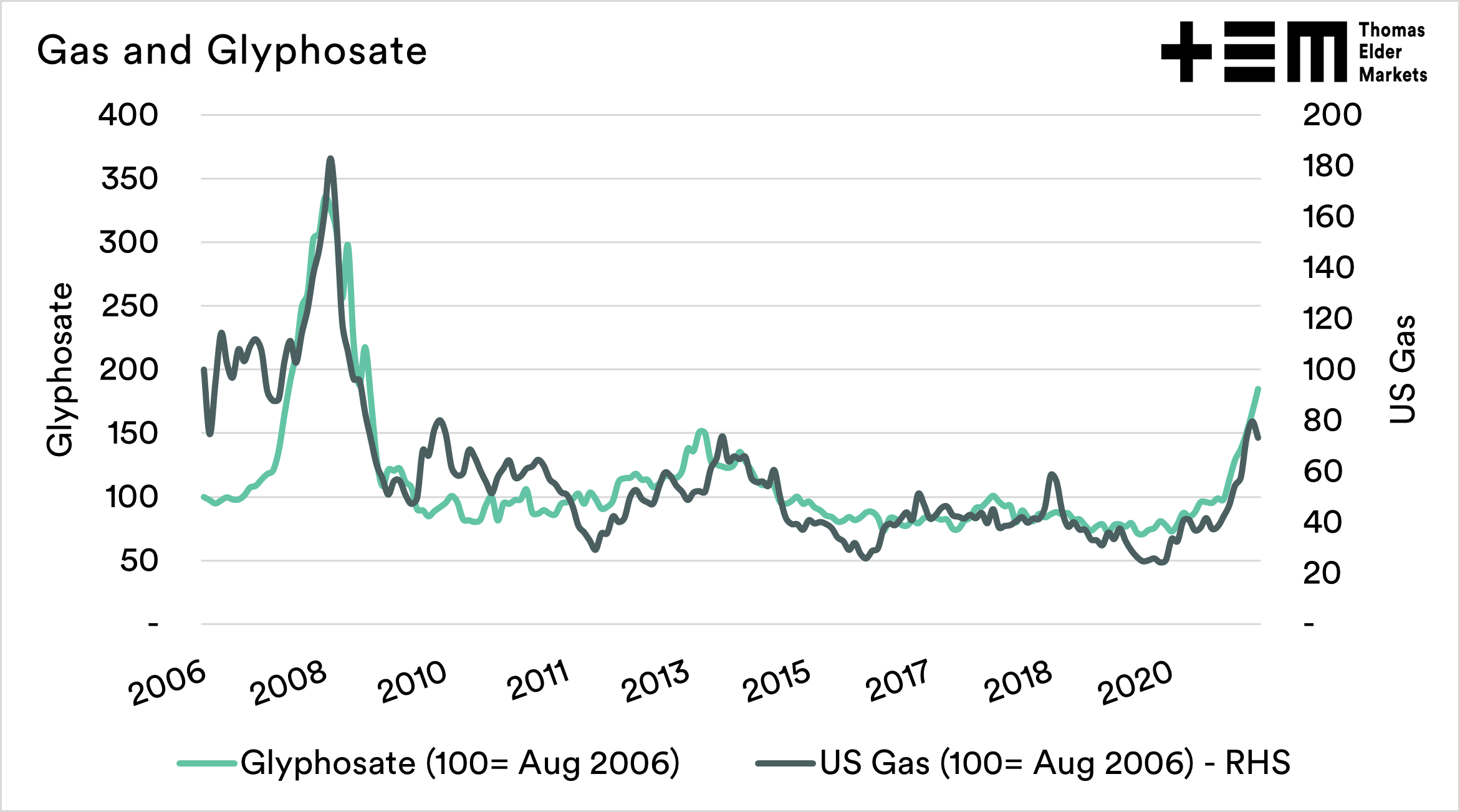 Glyphosate pricing levels have risen in strongly during 2021. There have been disruptions caused by covid, but one of the big drivers of the price of glyphosate is energy costs. In the chart below I have created an index of glyphosate and US gas pricing from 2006 to present (100=August 2006).