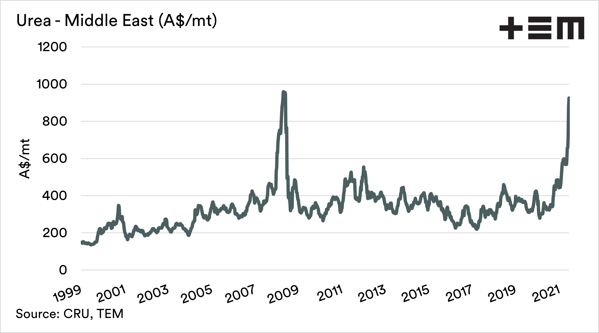 In A$ terms, Middle Eastern Urea is trading at A$925; this is just A$33 off the record high achieved in 2008. Whilst these prices are not delivered in Australia, they give an indication of the trend.