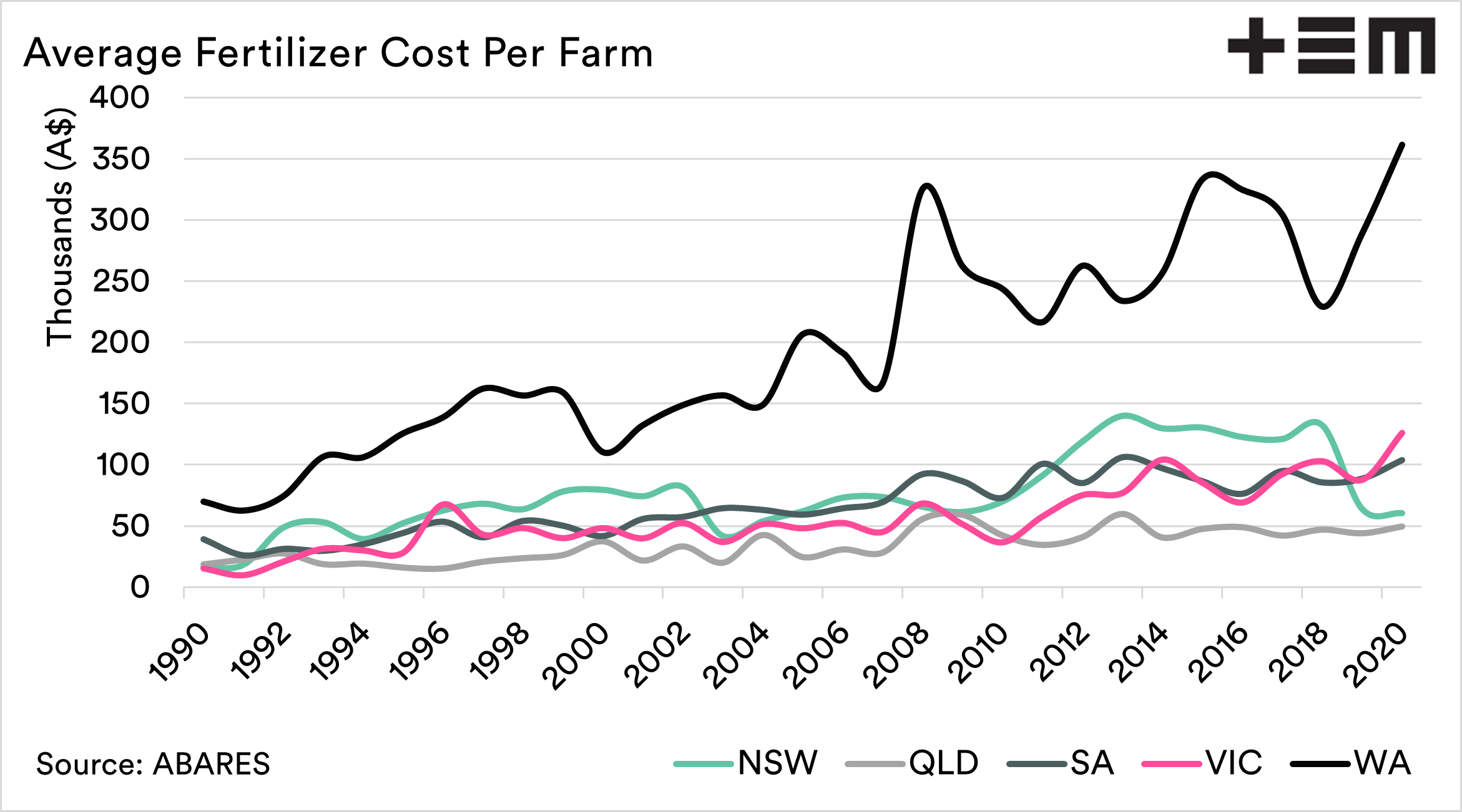 The first chart below is quite interesting and shows the average spending on fertilizer in Australian cropping farms on a state by state basis. According to survey data, Western Australia has seen the largest per farm increase in fertilizer costs. This could be down to a number of factors, including consolidation with larger farms emerging.