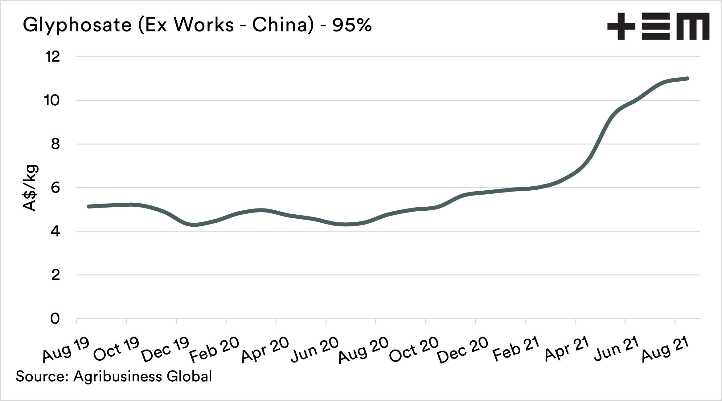 Glyphosate pricing has increased dramatically over recent months. Typically 95% glyphosate has traded around the A$4 to 5 level. As of the end of August, glyphosate has increased to A$11/kg.