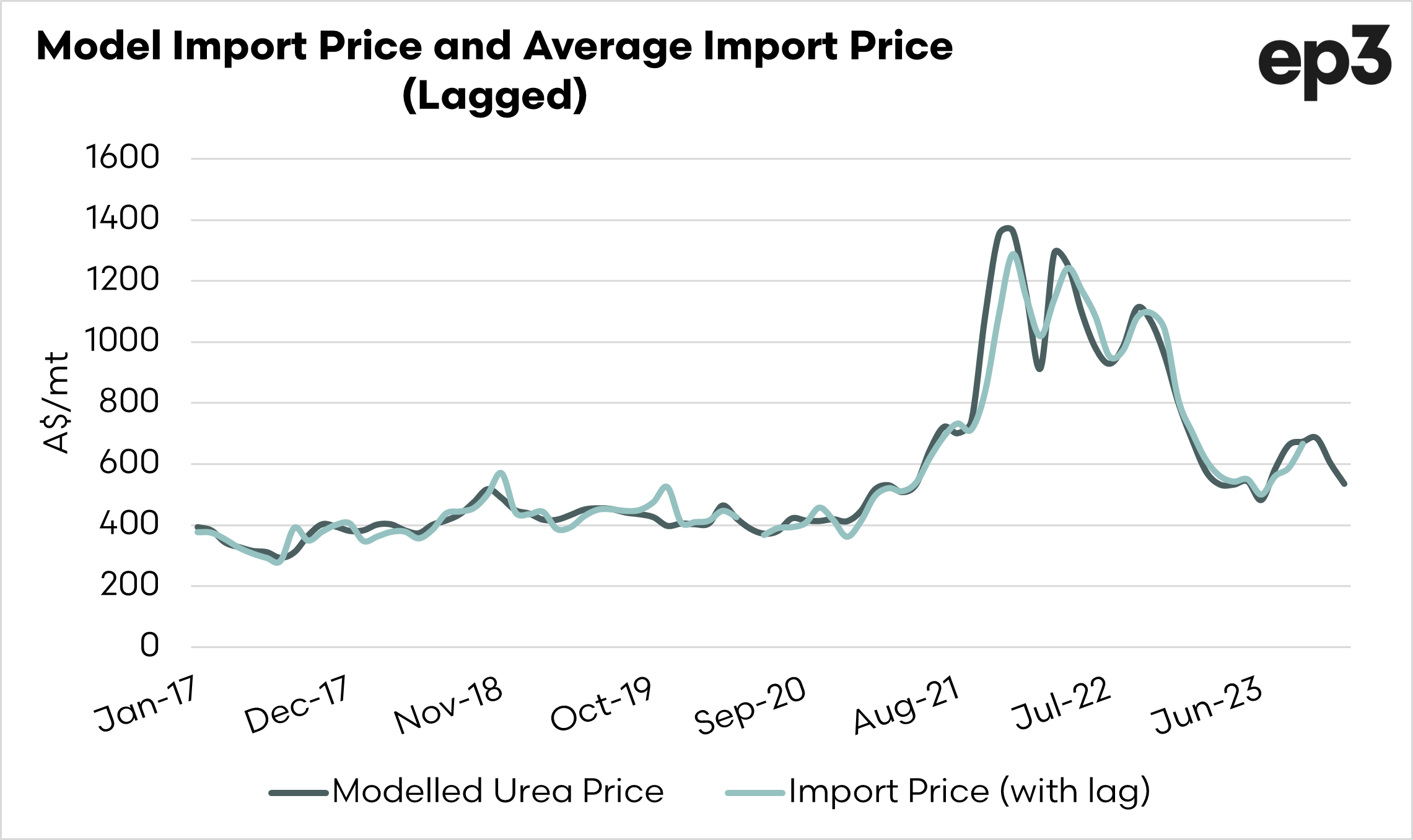 The second chart below shows the import price with a one-month lag, along with our modelled urea price. Urea pricing has increased in recent months, but our model shows that we may see a decline for the import value in the next month or two.