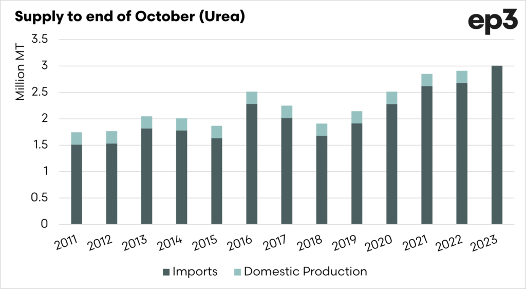 The data for urea imports to the end of October has been released. The imports of urea have been a topic of contention all year, as we hear of shortages in supply.