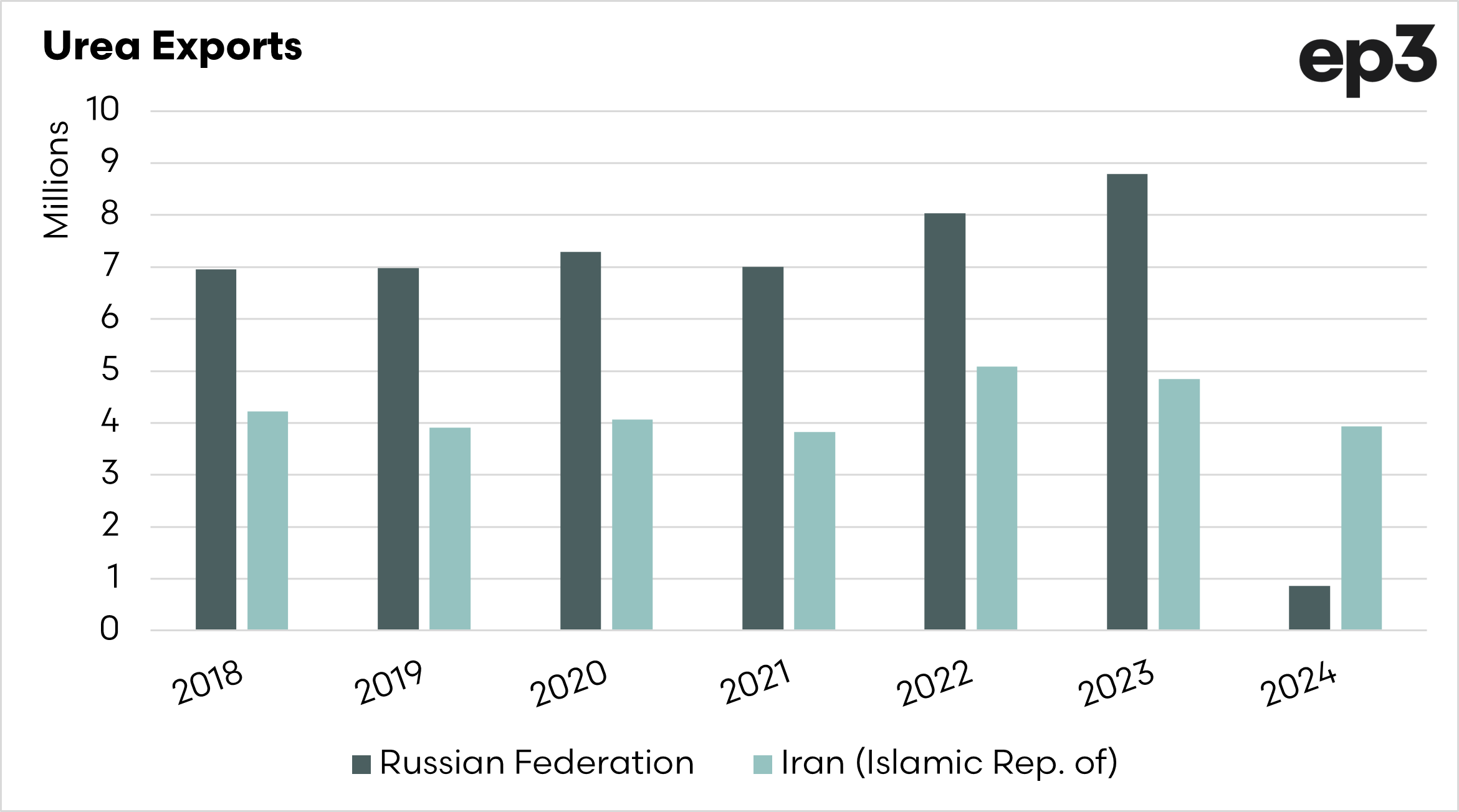 Iran and Russia could be considered pariah states in the global market, and if the conflict escalates, we could see urea supplies decline, which would impact price.