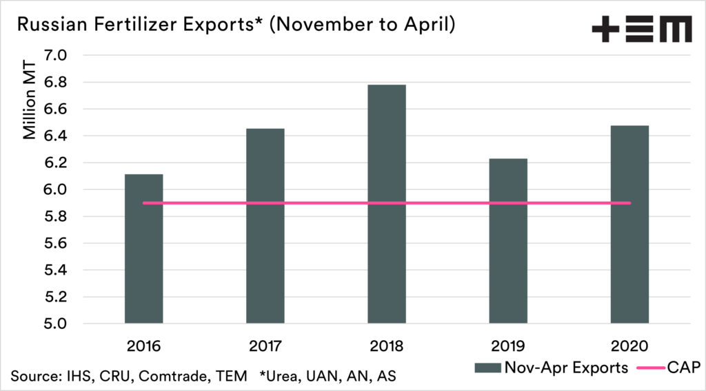 The first chart below shows the exports for the November – April period since 2016. Along with the cap. This chart is currently a work in progress as the industry awaits confirmation of how the permits will be provided and how they will be split across the different subtypes.