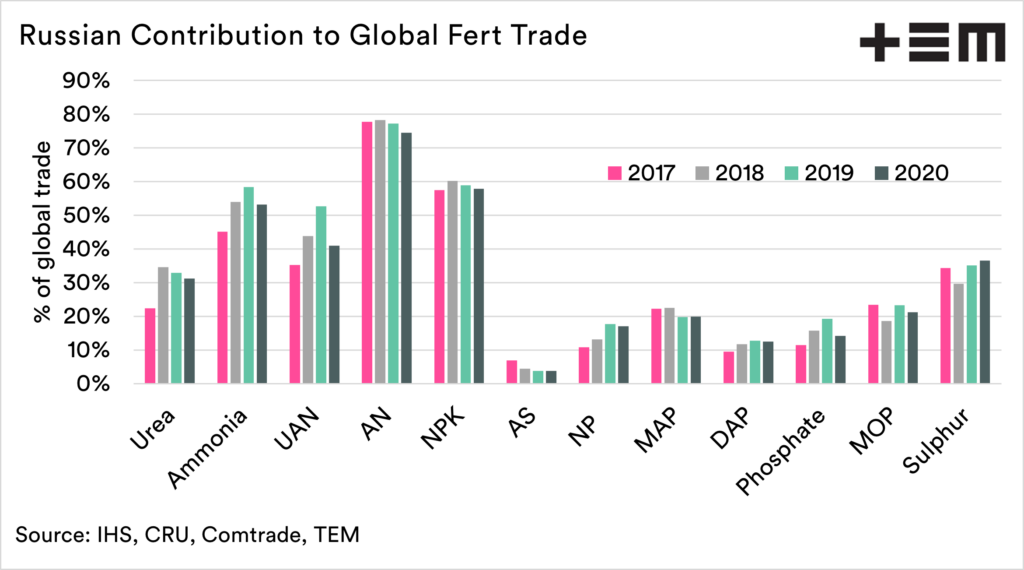 The second chart has been created to show the Russian contribution to the global fertilizer trade. This chart uses the data from the main exporters who represent the majority of export flows. As we can see, they are a significant export player.