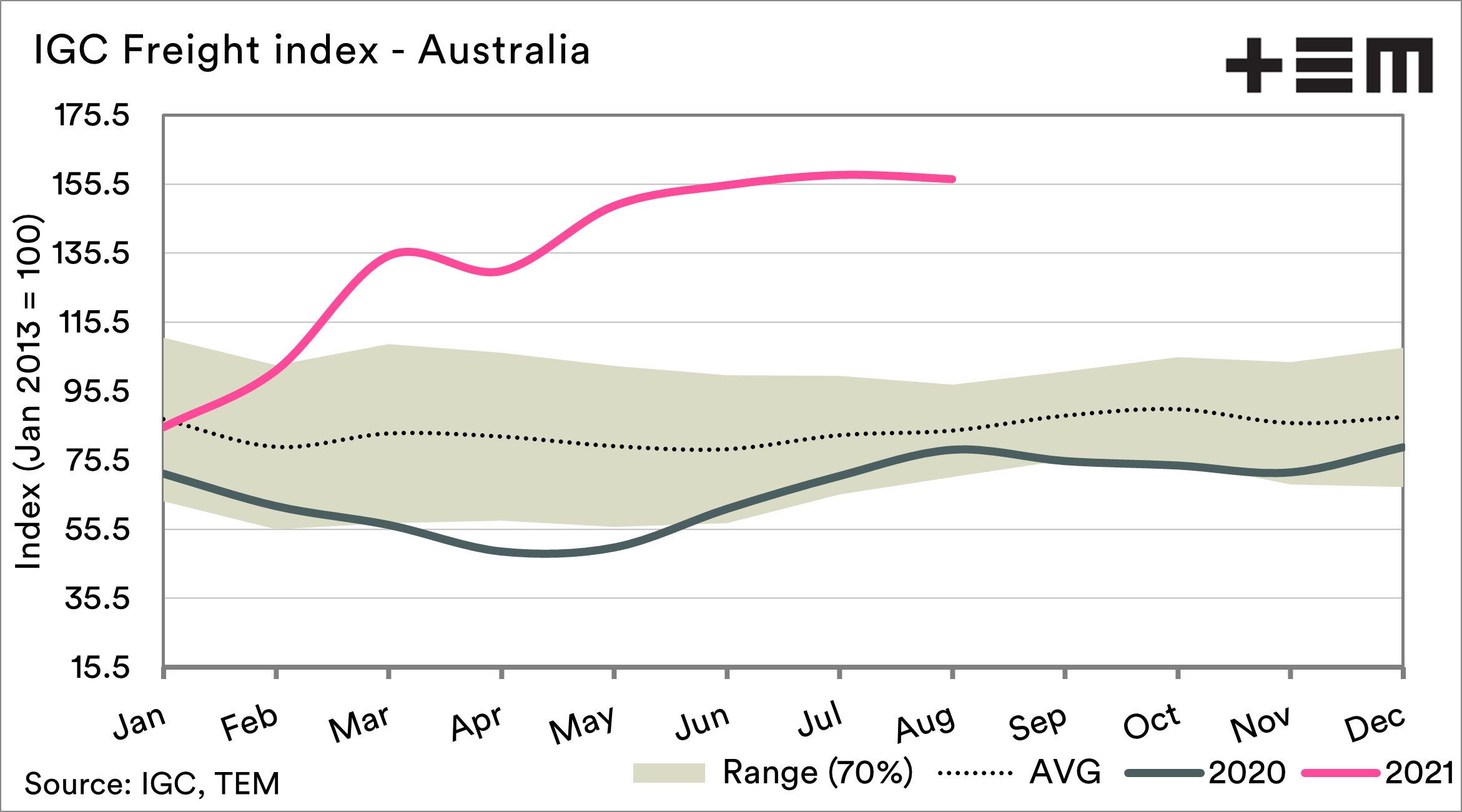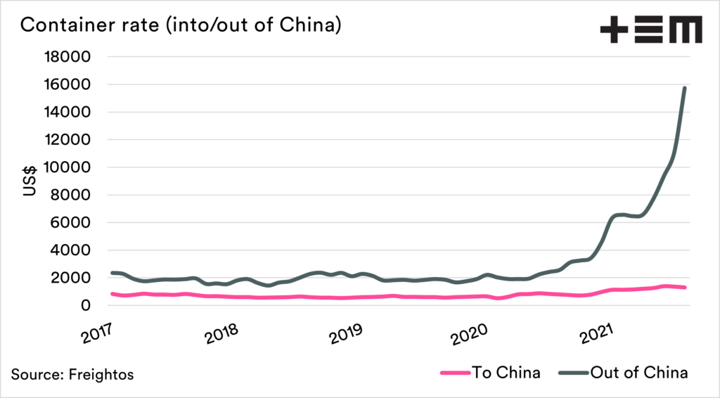 The container situation still remains very tight. Container rates into China have reached very high levels, with trade into China experiencing nowhere near the same lift. This is largely down to the positioning of empty containers and the COVID recovery being weighted towards China.