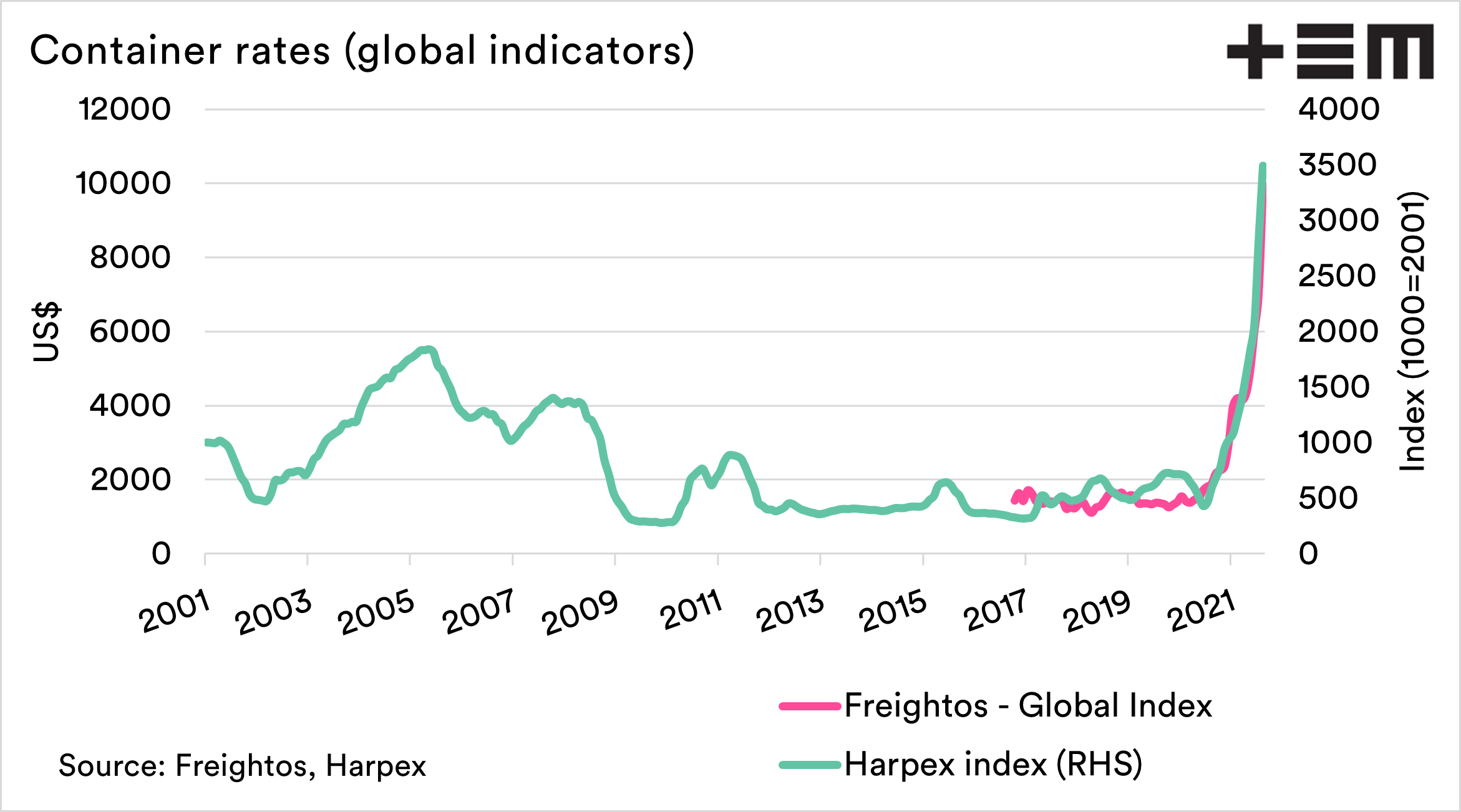 The chart below shows the global indicators for containers since 2001 to indicate how high pricing levels have got. The question is, how long before the pricing curtails demand?