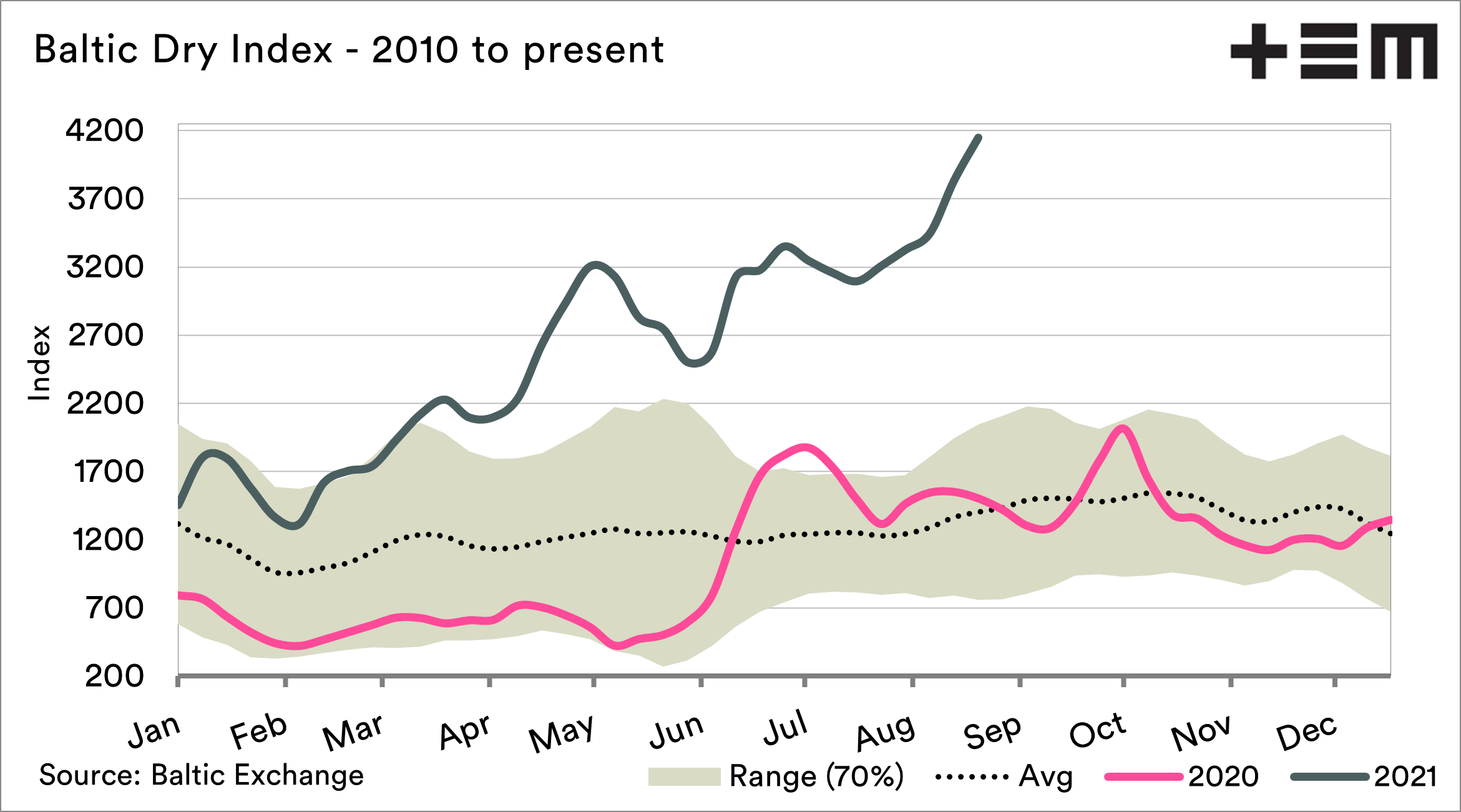 The majority of our grains are exported in bulk. The Baltic Dry Index (explainer here) has risen dramatically during August.