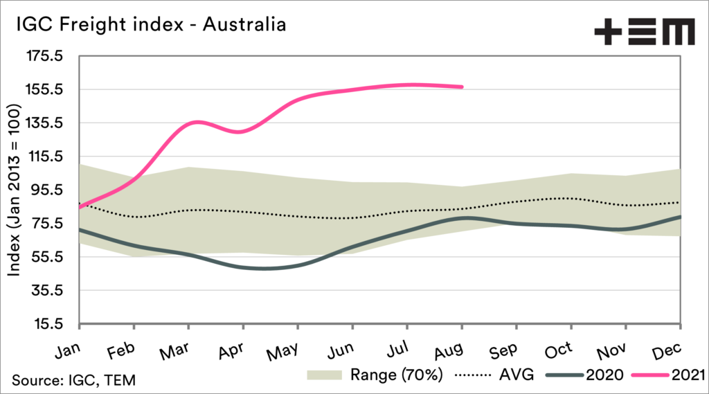 The local freight index for bulk ships ex Australia has seen pricing levels largely flatline compared to the overall picture. However, it remains at the highest levels since 2013.