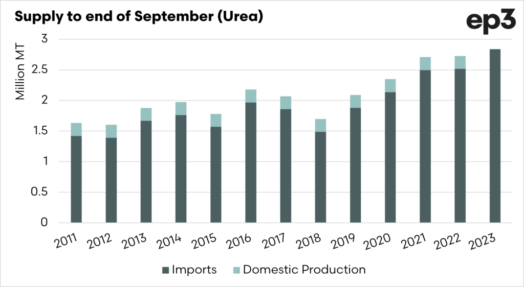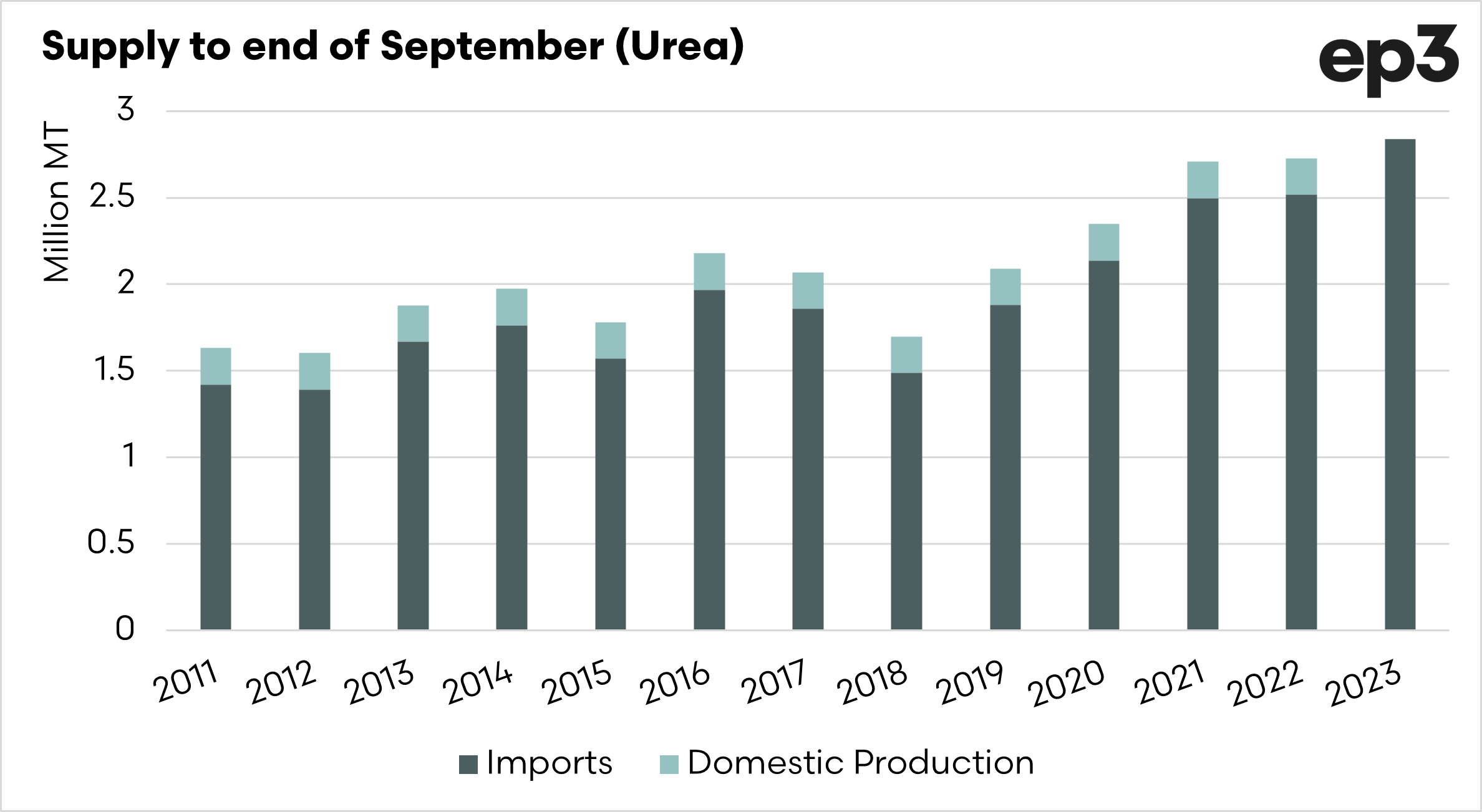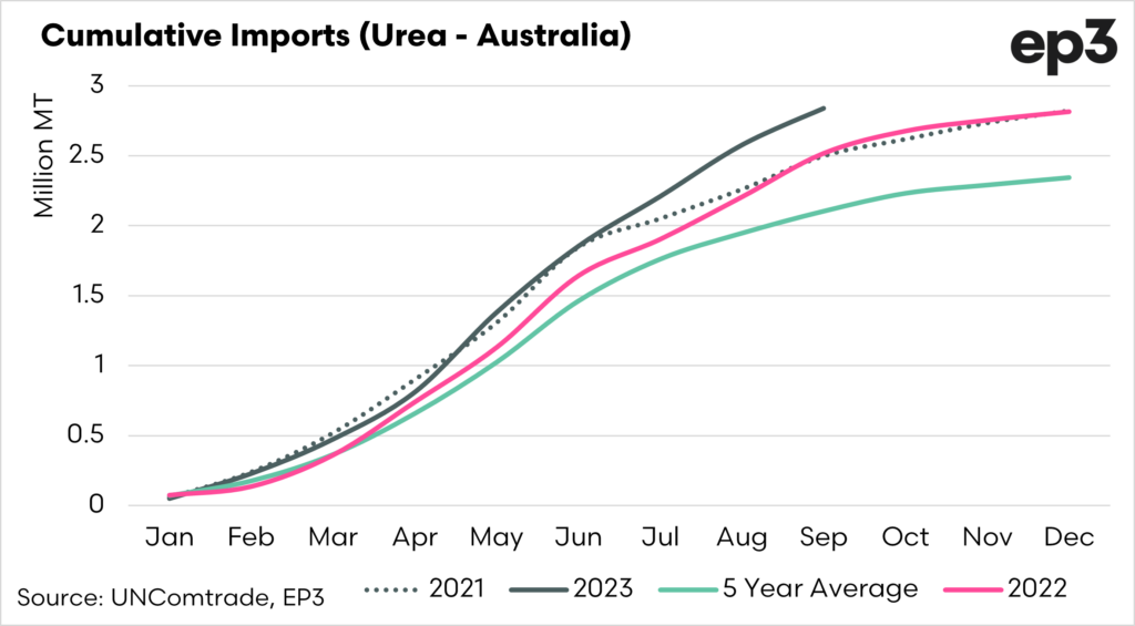 In the first chart below, we can see the cumulative imports of urea into Australia. Through to the end of September, 2.83mmt of urea has been imported across the country. This is a record volume, 319kmt higher than the previous record. This is a surplus above the production from the mothballed IPL facility on Gibson Island.