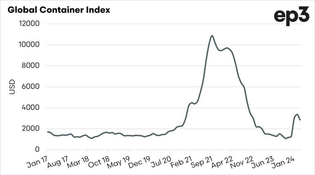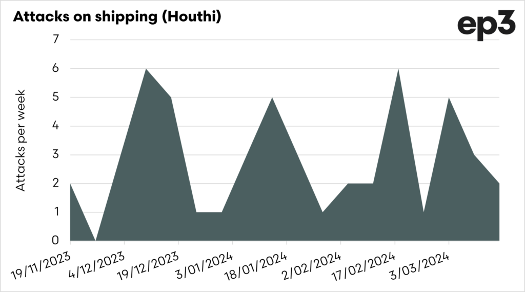 Since November, there have been 51 missile or drone attacks on shipping in this region, resulting in vessels having to reroute around the Cape of Good Hope in South Africa. This equates to around 15 days extra voyage time.