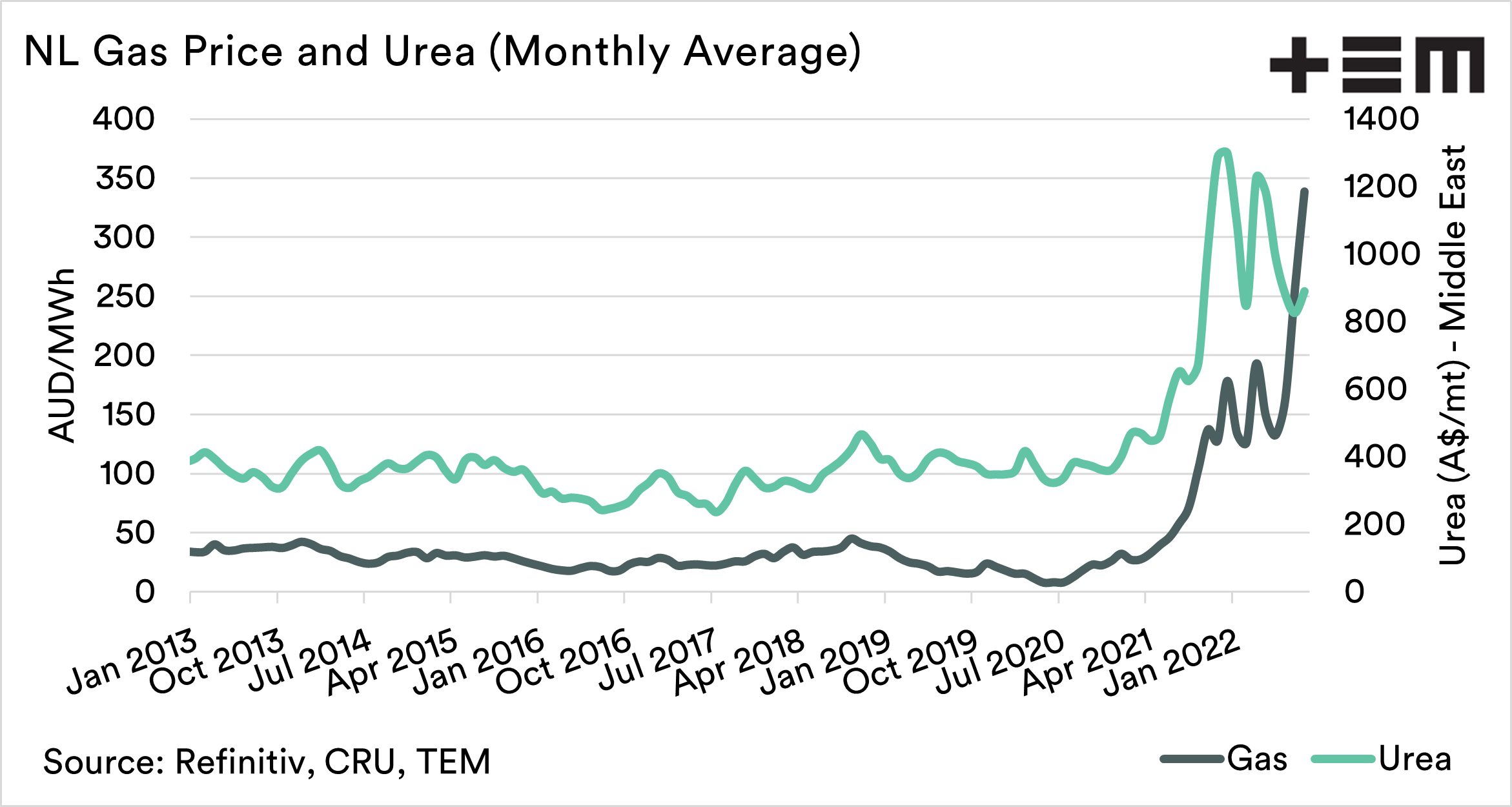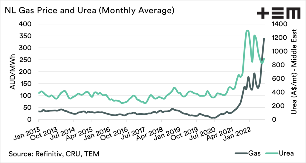 We keep a close eye on it because of its relationship with nitrogen fertilizer pricing. The first chart below shows the relationship between urea and natural gas. At its simplest, natural gas is the main input for production. If the price rises, then the cost of producing fertilizer increases.