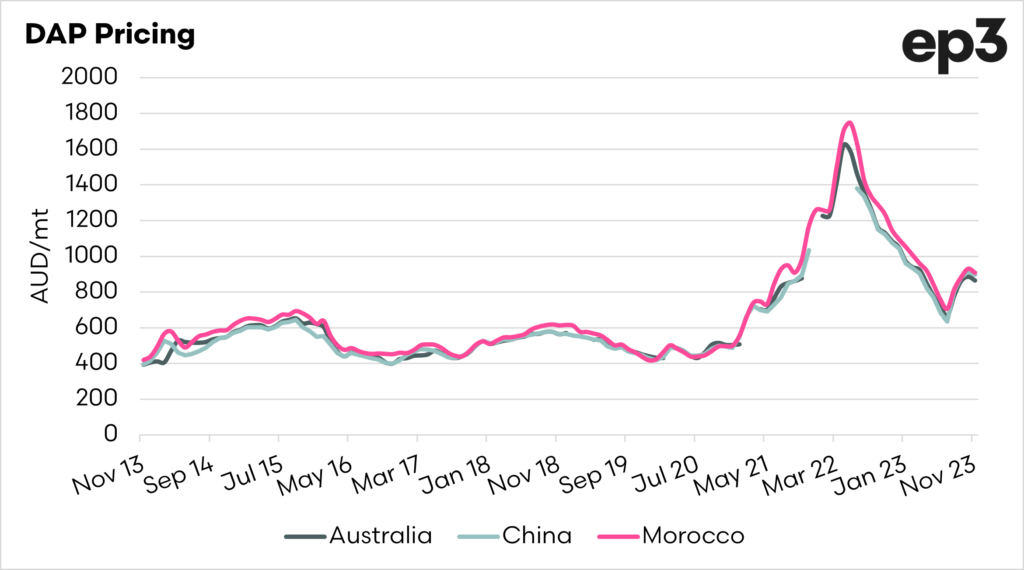 Let’s look at pricing around the world for DAP. In the second chart, the price of DAP (FOB/A$). At present, DAP in Australia is quoted at around A$850-875 for November. This is based on the price loaded onto a vessel.