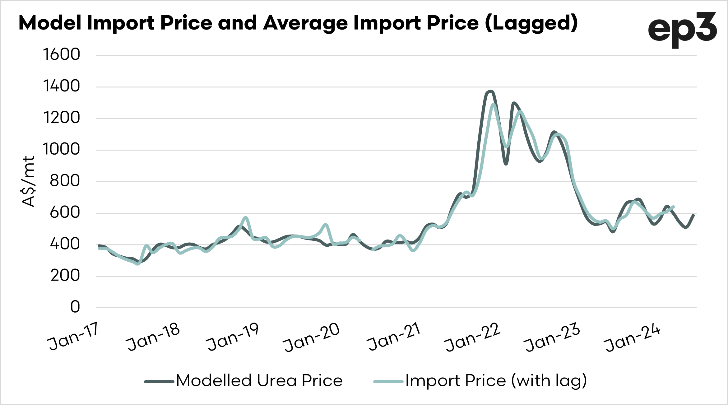 Due to the lack of transparency in the Australian fertilizer market, EP3 produces a landed price model. This is effectively the cost of purchasing urea and having it shipped to Australia.