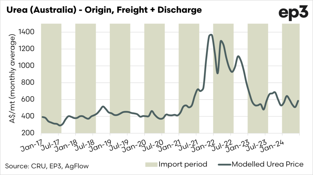 The purpose of this is to give an indicator of the trend of urea. It won’t be the price you pay on the farm, but it is the price of the urea landed at an average Australian port before additional land costs and margins. To be clear, it indicates the trend of pricing.